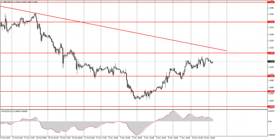 Фундаментальное событие на вторник запланировано только одно – выступление главы ЕЦБ Кристин Лагард. Напомним, что в последний месяц Лагард выступала в среднем три раза в неделю, а не так давно ЕЦБ провел предпоследнее заседание в этом году. Таким образом, вся необходимая информация – у трейдеров на руках. ЕЦБ не планирует в ближайшее время изменять процентные ставки, доволен темпами экономического роста, доволен уровнем инфляции. Таким образом, никаких важных заявлений от Кристин Лагард мы не ожидаем. Советуем ознакомиться с другими статьями автора:Обзор пары EUR/USD. 11 ноября. Дональд Трамп и ФРС.Обзор пары GBP/USD. 11 ноября. Как сделать хорошую мину при плохой игре?Торговые рекомендации и разбор сделок по EUR/USD на 11 ноября. Торговые рекомендации и разбор сделок по GBP/USD на 11 ноября.Общие выводы: