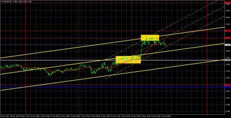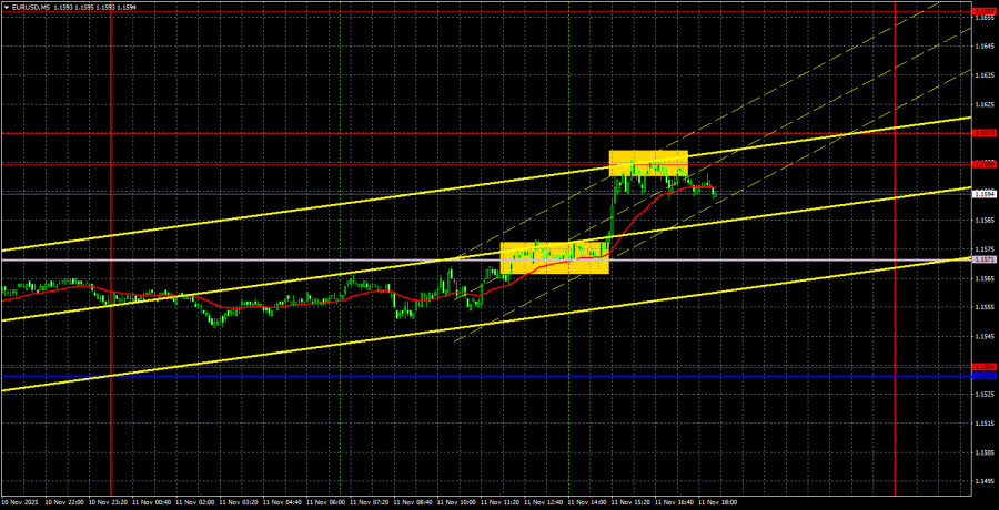 Валютная пара EUR/USD во вторник продолжала восходящее движение, как и предполагалось. Несмотря на то, что важных событий на вчерашний день не было запланировано никаких, а новости о завершающемся «шатдауне» по логике вещей должны поддерживать доллар, рынок продолжил скупать европейскую валюту. Нелогично? Точно также нелогично, как наблюдать в октябре рост американской валюты во время продолжающегося «шатдауна» и под аккомпанемент новых пошлин Дональда Трампа. Пара EUR/USD остается во флэте на дневном ТФ, и этим все объясняется. В ходе последнего витка падения цена опустилась практически к нижней линии бокового канала 1,1400-1,1830, а сейчас уже четыре дня растет. Таким образом, можно предположить, что алогичное падение пары завершено, и теперь нас ждет логичный рост. Почему логичный рост? Потому что глобальный фундаментальный фон остается всецело на стороне европейской валюты. У доллар нет ни одного «козыря» в рукаве, пока Дональд Трамп остается президентом США. Напомним, что Трамп даже во время своего первого президентского срока не скрывал, хочет видеть более дешевый доллар. Как можно ждать от доллара роста, если даже президент хочет его ослабить? На 5-минутном ТФ вчера сформировался неплохой сигнал на покупку около линии Сенкоу Спан Б. После преодоления этой важной линии цена продолжила восходящее движение и буквально через час достигла ближайшую цель – область 1,1604-1,1615, где и можно было фиксировать прибыль.Советуем ознакомиться с другими статьями автора: