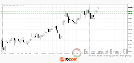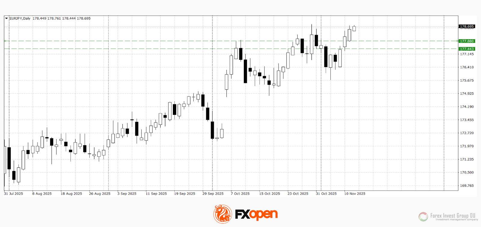 Пара EUR/JPY вновь приблизилась к недавним максимумам у 178.80. При сохранении восходящего импульса возможен тест круглых отметок 179.00–180.00. Коррекционный откат возможен в область 177.40–177.90. Уверенное закрепление цены ниже 177.40 может способствовать началу более глубокого нисходящего отката.