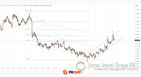 С 29 ноября по 12 декабря курс снизился (А→В) приблизительно на 2,9%, а потом поднялся к сегодняшнему пику (2), который находится как раз посередине между экстремумами А и В. С точки зрения пропорций Фибоначчи, это допустимо расценивать как нормальный откат к уровню 50%, после чего нисходящая динамика может продолжиться.