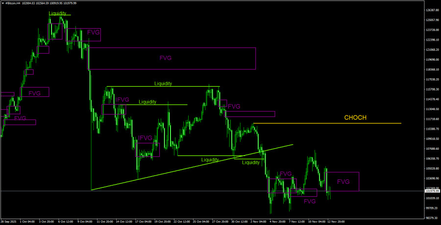На 4-часовом таймфрейме техническая картина преобразовалась, и теперь нисходящий тренд не вызывает сомнений. Линия CHOCH(слом тренда) проходит на уровне 111 100$, и только выше этого уровня можно будет считать, что локальная тенденция сломлена. При чем цена должна не просто пробить его(что будет считаться снятием ликвидности с очевидного экстремума), а закрепиться выше него. До этого нисходящий настрой рынка сохраняется. На 4-часовом ТФ в данное время можно отметить локальный «медвежий» FVG, от которого криптовалюта может продолжить падение. Если он будет отменен, мы можем увидеть новый виток коррекции с более глубоким заходом в FVG на дневном ТФ.Рекомендации по торговле BTC/USD: