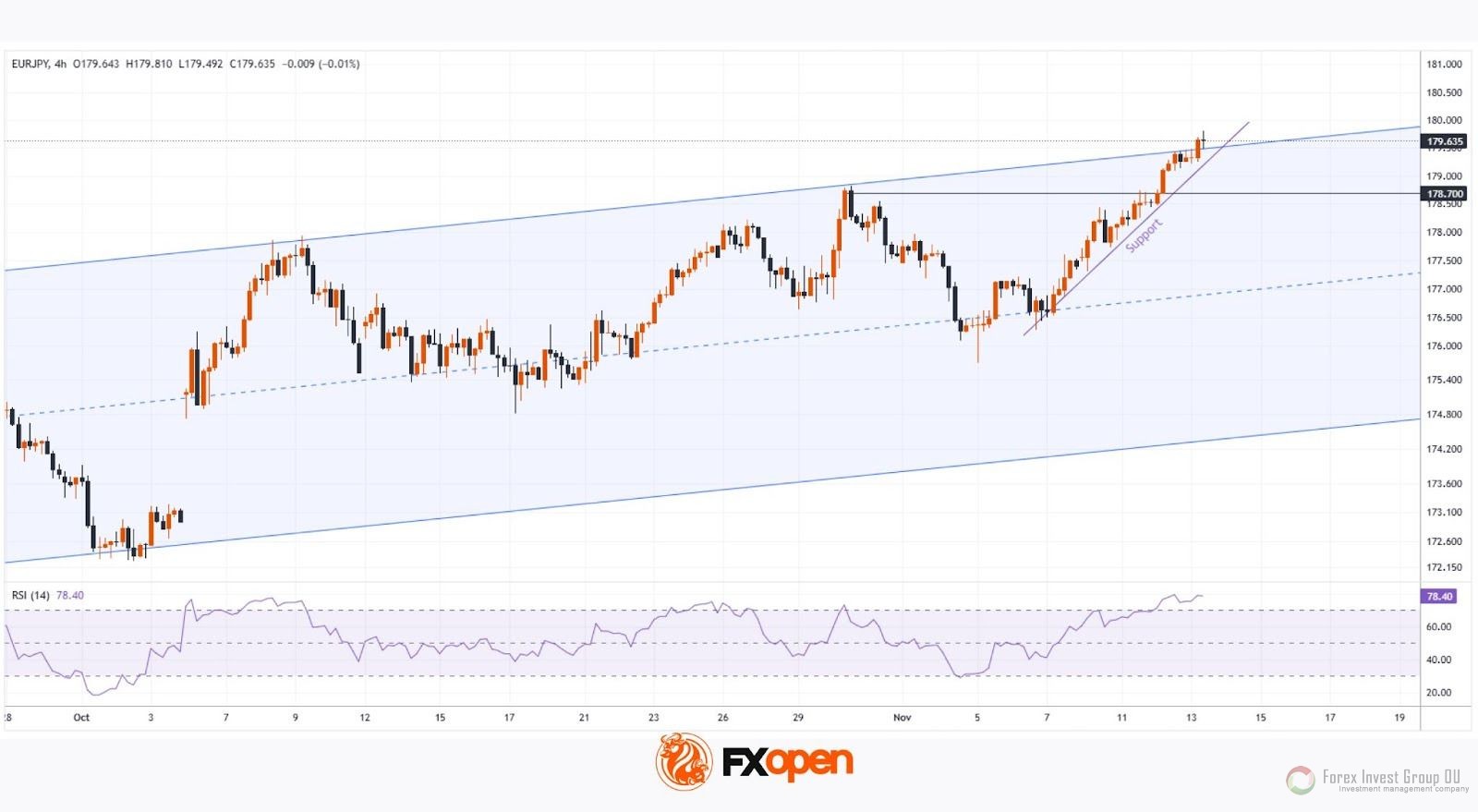 Колебания цены формируют восходящий канал (показан синим цветом). После того как в начале октября стало известно о победе Санаэ Такаити, которая считается последовательницей экономических стимулов, иена ослабла – курс EUR/JPY поднялся в верхнюю половину канала.