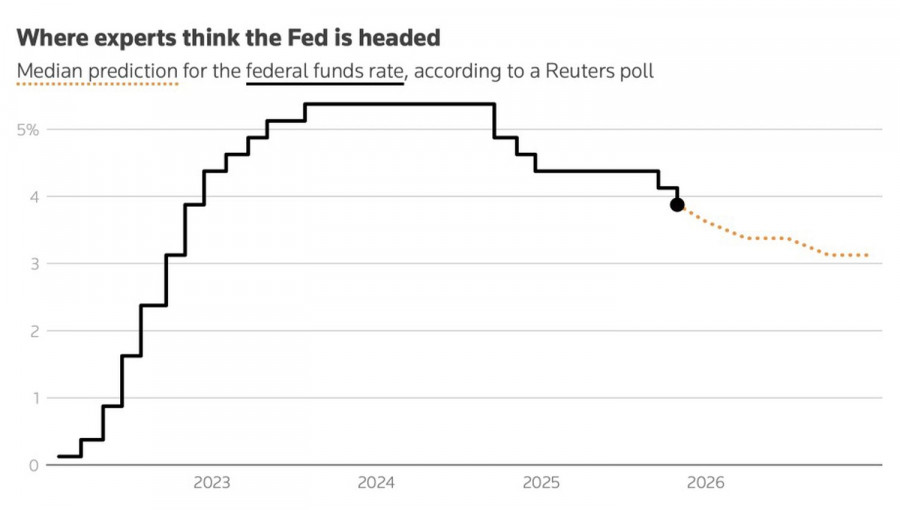 Все смешалось на международном валютном рынке. Если кто-то думал, что завершение шатдауна выведет ФРС и инвесторов из тумана, он ошибся. Неопределенность достигла апогея. Срочный рынок снизил шансы ослабления денежно-кредитной политики в декабре с 62-72% во время отключения правительства до менее чем 50%. Большинство экспертов Reuters, напротив, уверено в снижении ставки по федеральным фондам с 4,00% до 3,75% до конца года. EUR/USD больше верит специалистам, чем деривативам и взлетает выше отметки 1,16.