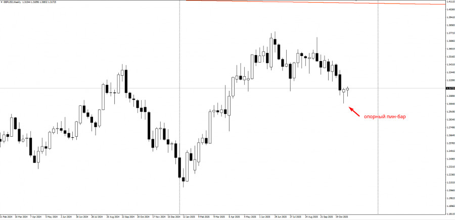 показывает признаки завершения падения, после чего может пойти продолжение лонговой тенденции.В качестве опорного недельного пин-бара можно выбрать сетап прошлой недели:Предлагаю рассмотреть лонговые позиции с отката на лонговый слом по схеме, представленной на скрине выше.
