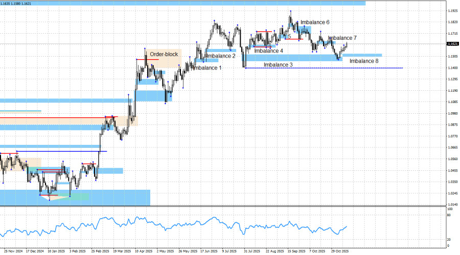 На прошлой неделе пара получила реакцию от имбаланса 3, а трейдеры имели возможность и основания для открытия сделок на покупку. В конце прошлой недели образовался новый «бычий» имбаланс 8 и теперь этот паттерн теперь выступает зоной поддержки для цены, а также зоной интереса трейдеров. Возврат котировок в эту зону и реакция на нее быков подтвердят мои ожидания в пользу дальнейшего роста и будут соответствовать текущей графической картине. Поэтому в текущих обстоятельствах я допускаю максимум небольшой коррекционный откат, чтобы цена могла отбалансировать себя в имбалансе 8. Однако откат – это не обязательное условие продолжения роста. Информационный фон в четверг был достаточно интересным. Дональд Трамп объявил о завершении «шатдауна», обе палаты Конгресса США одобрили законопроект о продлении финансирования до 31 января. В феврале, безусловно, Америка может столкнуться с новыми разногласиями в вопросах финансирования, но это будет в феврале. А сегодня доллар получил отличную возможность показать рост, но совершенно закономерно не воспользовался ею. Доллар рос полтора месяца, в течение которых продолжался «шатдаун». Если трейдеры игнорировали наличие «шатдауна», то должны были проигнорировать и его завершение. Причин у быков начать новое наступление имеется в достатке уже больше месяца, и все они сохраняют свою актуальность. Это и «голубиные» (в любом случае) перспективы ДКП FOMC, это и общая политика Дональда Трампа (которая не поменялась за последнее время), это и противостояние США с Китаем (где наступило лишь временное перемирие), это и акции протеста против Трампа (захлестнувшие Америку уже три раза в текущем году), это и слабость рынка труда, это и не радужные перспективы американской экономики (рецессия), это и «шатдаун» (который длился больше месяца). Таким образом, дальнейший рост пары, на мой взгляд, будет полностью закономерным. Не следует также упускать из виду торговую войну Трампа и его давление на FOMC. В данное время Трамп активно требует от Китая и Индии отказа от российской нефти в рамках компании по завершению войны в Украине. Против Индии Трамп повысил пошлины до 50%, а с Китаем вроде бы достигнуты некоторые договоренности, но всего лишь на один год. Новая эскалация – это вопрос времени. Вряд ли такой информационный плацдарм способствует «медвежьему» тренду. В «медвежий» тренд я по-прежнему не верю, но! В него придется поверить через 200 пипсов, если медведи возобновят свои атаки. Информационный фон по-прежнему крайне сложно интерпретировать в пользу доллара, поэтому я и не пытаюсь это делать. Синяя линия показывает ценовой уровень, ниже которого можно будет считать «бычий» тренд завершенным. До него медведям нужно пройти вниз еще около 170 пипсов. Ближайшей целью для роста европейской валюты остается «медвежий» имбаланс 1,1976 – 1,2092 на недельном графике, который был образован еще в июне 2021 года. Календарь новостей для США и Евросоюза: Евросоюз – Изменение объемов ВВП в третьем квартале (10-00 UTC). 14 ноября календарь экономических событий содержит в себе одну запись. Влияние информационного фона на настроение рынка в пятницу будет крайне слабым и только утром. Прогноз по EUR/USD и советы трейдерам: На мой взгляд, пара может находиться на завершающем этапе «бычьего» тренда. Несмотря на то, что информационный фон остае