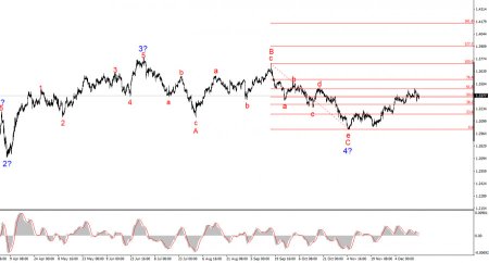 По инструменту GBP/USD волновая разметка продолжает свидетельствовать о построении повышательного участка тренда(картинка снизу), но в последние полгода она приняла сложный и протяженный вид(картинка сверху). Участок тренда, берущий свое начало 1 июля, можно считать волной 4. Или же любой глобальной коррекционной волной, так как она абсолютно точно имеет коррекционную, а не импульсную внутреннюю волновую структуру. Тоже самое касается и ее внутренних подволн. Понижательная структура волн, берущая начало 17 сентября, приняла пятиволновой вид a-b-c-d-e и завершена. Сейчас инструмент находится в стадии построения нового повышательного набора волн. Безусловно, любая волновая структура в любой момент может усложниться и принять более протяженный вид. Даже предполагаемая волна 4, которая строится уже 6 месяцев, может принять пятиволновой вид, а мы в этом случае будем еще несколько месяцев наблюдать коррекцию. Однако в данное время имеет все шансы на построение повышательный набор волн. Если это действительно так, то первые две волны этого участка уже построены, сейчас мы наблюдаем построение волны 3 или с, которая принимает импульсный вид и дает надежду на импульсный характер текущего набора волн.