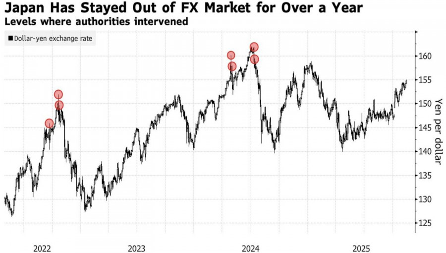 Формально основания для масштабных фискальных и монетарных стимулов у Санаэ Такаити имеются. По прогнозам экспертов Bloomberg, ВВП Страны восходящего солнца в третьем квартале сократился на 2,4%. На первой встрече с Кадзуо Уэдой премьер-министр заявила, что денежно-кредитная политика должна быть направлена как на достижение сильного экономического роста, так и на стабильность цен. Санаэ Такиити попросила главу Банка Японии регулярно отчитываться перед Советом по экономической и фискальной политики. Рынки восприняли это как повод отодвинуть повышение ставки овернайт на более отдаленную дату и купить USD/JPY. Стремление нового правительства к стимулам противоречит вербальным интервенциям. По словам министра финансов Сацуки Катаямы, в последнее время наблюдаются односторонние и быстрые движения в валюте. Официальный Токио следит за ними с высоким чувством срочности. Увы, но рынок не поверил. По мнению Mizuho Securities, ралли USD/JPY выше 155 усилит градус словесного вмешательства в жизнь Forex. Однако дело до валютных интервенций дойдет только в случае роста котировок пары выше 160. Динамика USDJPY и валютных интервенций Японии