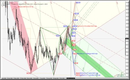 При пробое уровня поддержки 99.10 на ISL38.2 Minute-h4 развитие движения индекса доллара продолжится в зоне равновесия (99.20 - 98.70 - 98.35) вил младшего операционного масштаба Minute-h4 с учетом отработки нижней границы канала 1/2 Median Line (98.80) вил старшего операционного масштаба Minor-Daily и с перспективой достижения minimum 98.00 от 17 октября 2025 года конечной линии FSL Minute-h4 (97.20).