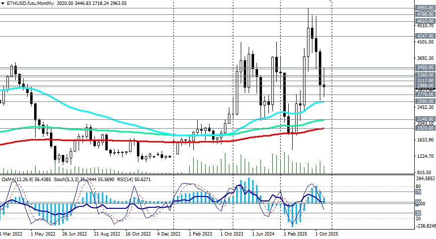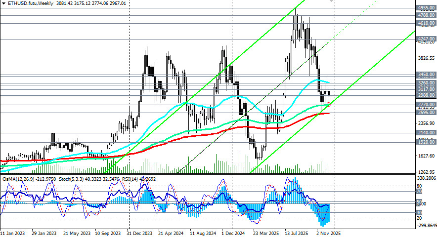 Несмотря на более слабые, чем ожидалось показатели американских CPI и новости из сферы крипторегулирования в США, до смены негативных настроений на крипторынке на позитивные еще пока далеко. Преобладает негативная динамика и сохраняющийся отток средств, отметили мы в нашем сегодняшнем фундаментальном анализе и обзоре «Крипторынок: негативные настроения инвесторов сохраняются. Так, на текущий момент капитализация всего крипторынка составляет примерно 2,93 трлн долларов, что на 41% меньше рекордных 4,15 трлн в конце сентября, по данным TradingView. А это значит, что преимущественными пока что, несмотря на сегодняшний рост, остаются короткие позиции, в том числе и по паре ETH/USD, предпринимающей попытку прорыва выше важного краткосрочного уровня сопротивления 2988.00 (ЕМА200 на 1-часовом графике). Текущая коррекция на рынке криптовалют не выглядит устойчивой, в то время как отток средств из биржевых фондов сохраняется, а индекс «страха и жадности» остается в зоне «страха». Ситуация на крипторынке остаётся сложной, а настроения инвесторов — сдержанно-негативными. Поэтому в основном сценарии ожидаем отбой от уровней 2988.00 – 3000.00 и возобновление снижения. Быстрым сигналом для новых коротких позиций также может стать пробой уровня поддержки 2902.00 (ЕМА200 на 15-минутном графике) и сегодняшнего минимума 2806.00. В случае снижения ближайшими целями станут отметки вблизи важного долгосрочного уровня поддержки 2770.00 (ЕМА144 и нижняя линия восходящего канала на недельном графике). В то же время цена остается в зоне долгосрочного бычьего рынка – выше ключевой зоны поддержки 2770.00 – 2595.00 (ЕМА200 на недельном графике). Поэтому при приближении к данным отметкам можно рассчитывать на отбой и возобновление роста котировок. В самом негативном сценарии и в случае дальнейшего падения пробой стратегических уровней поддержки 1920.00 (ЕМА200 на месячном графике), 1900.00 выведет ETH/USD в зону глобального медвежьего рынка. В альтернативном сценарии пробой зоны ближайших сопротивлений 2988.00 – 3000.00 может стать сигналом к открытию длинных позиций с целями на уровнях сопротивления 3200.00 - 3215.00 (ЕМА50 на дневном графике). Пробой же уровня сопротивления 3450.00 (ЕМА144 на дневном графике) подтвердит переход цены в зону среднесрочного бычьего рынка и возврат восходящей динамики. На это также, в частности, могут указывать технические индикаторы (в нашем случае это – RSI, OsMA, Стохастик), которые на дневном и недельном графиках начинают разворачиваться на длинные позиции. Пока же в преимуществе – короткие. Уровни поддержки: 2902.00, 2900.00, 2806.00, 2800.00, 2770.00, 2600.00, 2595.00, 2500.00 Уровни сопротивления: 2988.00, 3000.00, 3100.00, 3117.00, 3215.00, 3260.00, 3400.00, 3415.00, 3450.00 Торговые сценарии