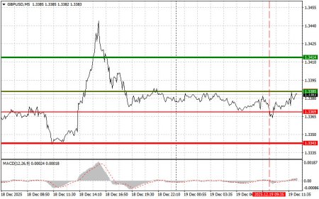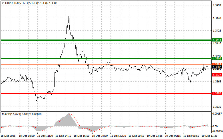 Разбор сделок и советы по торговле британским фунтомТест цены 1.3369 пришелся на момент, когда индикатор MACD только начинал движение вниз от нулевой отметки, что стало подтверждением правильной точки входа на продажу фунта. Однако до крупного падения пары дело так и не дошло.Несмотря на то, что объём розничной торговли в Великобритании сократился на 0,1% в ноябре этого года, фунт почти никак на это не отреагировал. Хотя данные и стали неприятным сюрпризом для рынка, ожидавшего увидеть подтверждение устойчивости потребительского спроса.Во второй половине дня акцент будет смещен на цифры по объему продаж жилья на вторичном рынке США, а также на индекс настроения потребителей и инфляционные ожидания от Университета Мичигана. Эти данные станут важным индикатором состояния американской экономики и потребительской уверенности. Показатели продаж жилья на вторичном рынке традиционно рассматриваются как опережающий индикатор экономической активности. Индекс настроения потребителей от Университета Мичигана предоставит информацию о том, как американцы оценивают текущую экономическую ситуацию и какие ожидания они возлагают на будущее. В случае, если показатели окажутся хуже ожиданий, это может привести к снижению котировок американского доллара и к укреплению британского фунта.Что касается внутридневной стратегии, то больше буду опираться на реализацию сценариев №1 и №2.Сигнал на покупкуСценарий №1: покупать фунт сегодня планирую при достижении точки входа в районе 1.3392 (зеленая линия на графике) с целью роста к уровню 1.3414 (более толстая зеленая линия на графике). В районе 1.3414 буду выходить из покупок и открывать продажи в обратную сторону (расчет на движение в 30-35 пунктов в обратную сторону от уровня). На рост фунта сегодня можно рассчитывать только после слабых данных по США. Важно! Перед покупкой, убедитесь в том, что индикатор MACD находится выше нулевой отметки и только начинает свой рост от нее.Сценарий №2: покупать фунт сегодня также планирую в случае двух подряд тестов цены 1.3372 в момент, когда индикатор MACD будет находиться в области перепроданности. Это ограничит нисходящий потенциал пары и приведет к обратному развороту рынка вверх. Можно ожидать рост к противоположным уровням 1.3392 и 1.3414.Сигнал на продажу Сценарий №1: продавать фунт сегодня планирую после обновления уровня 1.3372 (красная линия на графике), что приведет к быстрому снижению пары. Ключевой целью продавцов выступит уровень 1.3350 где буду выходить из продаж, а также открывать сразу покупки в обратную сторону (расчет на движение в 20-25 пунктов в обратную сторону от уровня). Давление на фунт сегодня может вернуться в любой момент. Важно! Перед продажей, убедитесь в том, что индикатор MACD находится ниже нулевой отметки и только начинает свое падение от нее.Сценарий №2: продавать фунт сегодня также планирую в случае двух подряд тестов цены 1.3392 в момент, когда индикатор MACD будет находиться в области перекупленности. Это ограничит восходящий потенциал пары и приведет к обратному развороту рынка вниз. Можно ожидать снижения к противоположному уровню 1.3372 и 1.3350.Что на графике:Тонкая зеленая линия – цена входа, по которой можно покупать торговый инструмент;Толстая зеленая линия – предположительная цена, где можно расставлять Take Profit или самостоятельно фиксировать прибыль, т