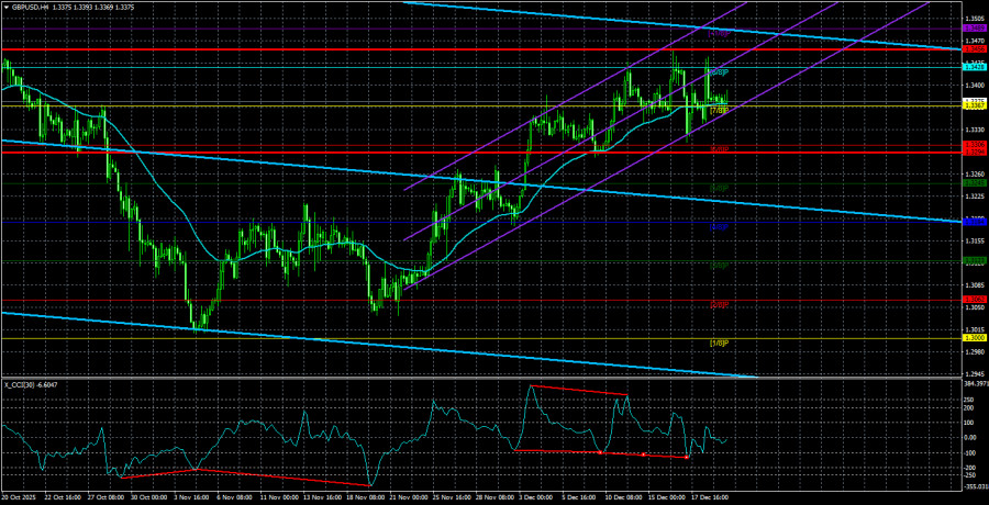 Валютная пара GBP/USD в пятницу показал волатильность равную 37 пунктам. Движений на рынке не было никаких, несмотря на несколько макроэкономических публикаций в Великобритании и США. Ранее на неделе были опубликованы важнейшие данные по рынку труда, безработице и инфляции в США. Состоялось заседание Банка Англии, на котором было принято решение понизить ключевую ставку. Были опубликованы данные по деловой активности, безработице и инфляции на Туманном Альбионе. И все, чего заслужили трейдеры на этой неделе – флэт. Торговался фунт стерлингов только три дня: вторник, среду и четверг. И даже в эти дни сказать, что волатильность зашкаливала, не получится. Движения в эти дни были разнонаправленными, но мы уже говорили, что в таком обилии информации рынок просто запутался. А помимо этого приближаются Рождество и Новый год. Желание у рынка торговать снижается. С одной стороны, в условиях «тонкого рынка» можно рассчитывать на резкие рывки цены в любом направлении. С другой стороны, рынок просто может уйти на каникулы. Ключевым событием прошедшей недели для британского фунта стал отчет по инфляции. Именно он определил судьбу ключевой ставки БА в декабре. Если бы инфляция не показала замедление по итогам ноября до 3,2%, вполне возможно, что регулятор не решился бы на смягчение монетарной политики. Напомним, что на прошлом заседании Банк Англии принял сложное решение с минимальным перевесом голосов в пользу сохранения ставки. И на этом заседании также было принято сложное решение с перевесом в один голос. Таким образом, мягко говоря, даже при снижении инфляции половина Комитета по монетарной политике сомневается к целесообразности смягчения. Из этого следует, что в следующем году Банк Англии возьмет паузу. В отличие от ФРС, которой по-прежнему нужно спасать рынок труда, Банк Англии чувствует себя более уверенно. Безработица на Туманном Альбионе тоже растет, но она заставляет переживать Британский центробанк меньше. В целом, мы ожидаем, что оба центральных банка продолжат смягчение в 2026 году, но у ФРС перспективы более «голубиные». Если же абстрагироваться от монетарной политики, то мы не видим никаких изменений в глобальном фундаментальном фоне, которые могли бы оказать доллару долгосрочную поддержку. На дневном ТФ пара GBP/USD преодолела облако Ишимоку и «ушла в отпуск». Однако восходящий тренд 2025 года сохраняется, поэтому мы ждем его возобновления. Отменится этот сценарий только в том случае, если на дневном ТФ произойдет закрепление ниже критической линии. На 4-часовом ТФ предупреждением о новом падении послужит преодоление скользящей средней линии. Однако будьте осторожны. На этой неделе мы уже наблюдали движение, очень похожее на флэт. А в последние дни уходящего года флэт еще более вероятен. Средняя волатильность пары GBP/USD за последние 5 торговых дней составляет 81 пункт. Для пары фунт/доллар это значение является «средним». В понедельник, 22 декабря, таким образом, мы ожидаем движения внутри диапазона, ограниченного уровнями 1,3294 и 1,3456. Старший канал линейной регрессии направлен вниз, но только из-за технической коррекции на старших ТФ. Индикатор CCI шесть раз заходил в область перепроданности за последние месяцы и сформировал множество «бычьих» дивергенций, что постоянно предупреждает о возобновлении восходящего тренда. На этой неде