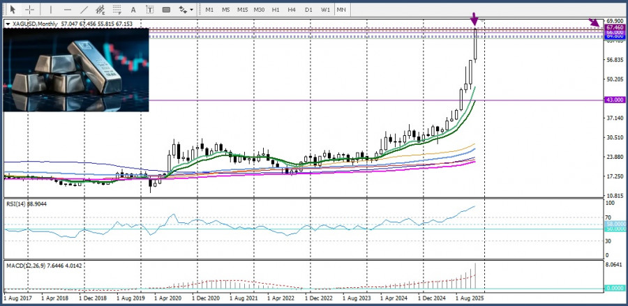 Технический анализ показывает, что серебро сохраняет бычий тренд как на долгосрочных, так и на краткосрочных графиках. В то же время, в текущий момент рынок находится в зрелой фазе бычьего цикла, и, вероятно, в ближайшие месяцы потребуется коррекция. Товары, включая металлы, характеризуются высокой цикличностью и проходят череду подъёмов и спадов. Очевидно, что сейчас серебро находится на подъеме, и следующим этапом, скорее всего, будет спад. Единственная неопределенность — когда именно начнется этот коррекционный цикл. Исходя из масштабов бума, заметных на месячном графике, спад, скорее всего, будет серьёзным, и вероятнее всего приблизительно в середине 2026 года или чуть раньше. Однако после этого спада снова начнется новый цикл роста — закономерность, подтверждающаяся историями сырьевых рынков.А на текущий момент, серебро установило новый исторический максимум $67,46, несмотря на то, что в пятницу доходность казначейских облигаций США и доллар США оставались стабильными. На фоне отсутствия катализаторов, за исключением опроса потребительских настроений в США, проведенного Мичиганским университетом, который показал, что американские домохозяйства сокращают расходы на товары длительного пользования и обеспокоены ситуацией на рынке труда.