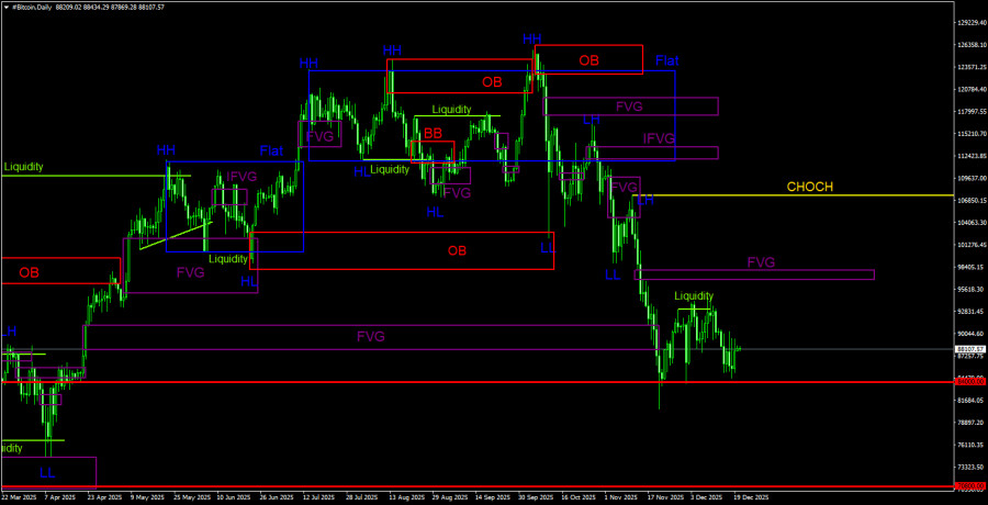 На 4-часовом таймфрейме техническая картина также однозначно указывает на нисходящий тренд, а цена покинула боковой канал. Линия CHOCH(слом тренда), которая проходила на уровне 87 600$, преодолена, а значит краткосрочная восходящая тенденция сломлена. Последний «медвежий» FVG не дал реакции рынка. Не исключено, что флэт примет более сложную и широкую форму. Мы по-прежнему советуем исходить в торговле из «медвежьих» сигналов.Рекомендации по торговле BTC/USD: