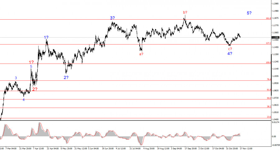 Волновая разметка 4-часового графика для инструмента EUR/USD преобразилась, но в целом имеет вполне понятный вид. Об отмене повышательного участка тренда, который берет свое начало в январе 2025 года, речи не идет, но волновая структура, начиная с 1 июля значительно усложнилась и приняла более протяженный вид. На мой взгляд, инструмент находится в стадии построения коррекционной волны 4, которая приняла нестандартный вид. Внутри этой волны мы наблюдаем исключительно коррекционные структуры, поэтому сомнений в коррекционном характере снижения не возникает. Построение повышательного участка тренда продолжается, а новостной фон продолжает поддерживать по большей части не доллар. Торговая война, начатая Дональдом Трампом, продолжается. Противостояние президента с ФРС может выйти на новый уровень в 2026 году. «Голубиные» ожидания рынка по ставке ФРС остаются высокими, особенно на следующий год. Рынок труда «охлаждается». Официальной статистики нет. Я считаю, что последнее укрепление доллара – это в некоторой степени парадокс. Но на рынках случаются парадоксы. На мой взгляд, построение повышательного участка тренда не завершено, а его цели разбросаны вплоть до 25-й фигуры. Серия волн a-b-c-d-e выглядит завершенно, следовательно, я в ближайшие недели ожидаю построения повышательного набора волн.