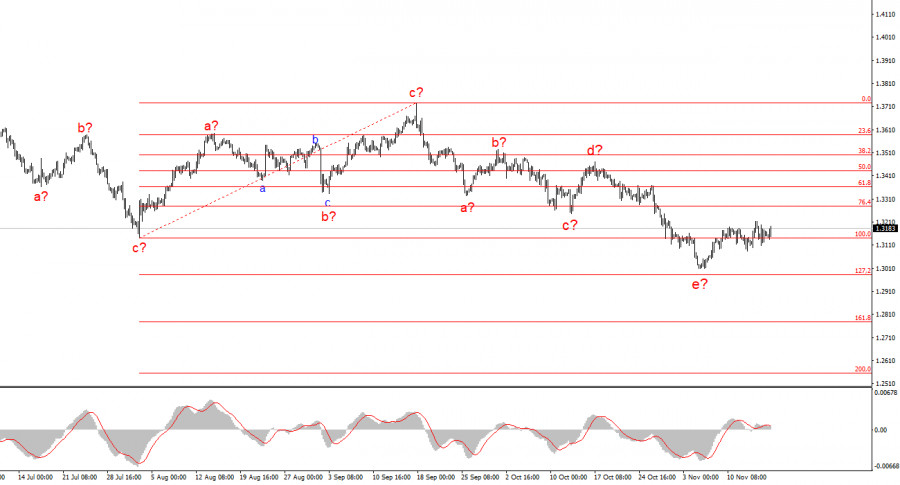 Исходя из проведенного анализа EUR/USD, я делаю вывод, что инструмент продолжает построение повышательного участка тренда. В последние несколько месяцев рынок взял паузу, но политика Дональда Трампа и ФРС остаются весомыми факторами падения американской валюты в будущем. Цели текущего участка тренда могут простираться вплоть до 25-й фигуры. В данное время продолжается построение коррекционной волны 4, которая принимает очень сложный и протяженный вид. Последняя ее внутренняя структура – a-b-c-d-e предположительно завершена. Если это действительно так, то я ожидаю повышения инструмента с целями, расположенными около годовых максимумов. Волновая картина по GBP/USD: