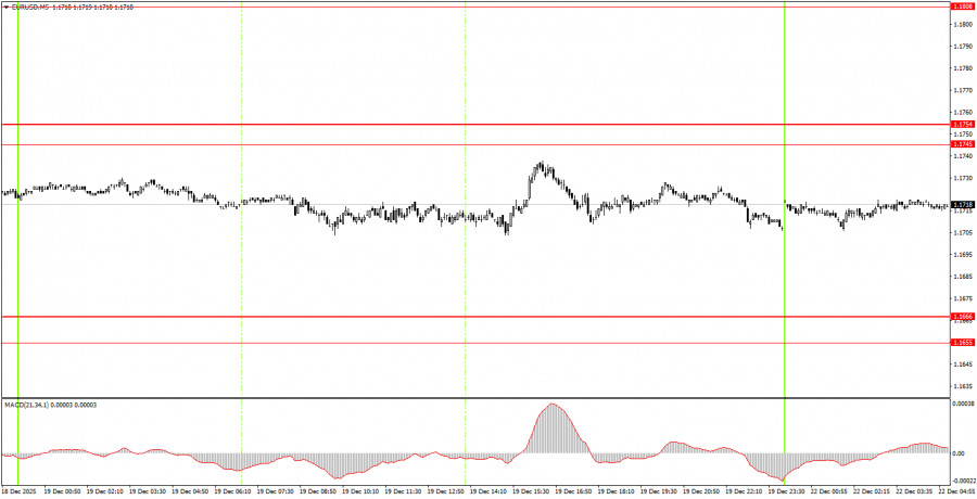 Валютная пара EUR/USD в пятницу не двигалась с места. Общая волатильность дня составила пунктов 30, что, по сути, означает полное отсутствие движений. Хотим напомнить, что на прошлой неделе было опубликовано огромное количество важнейшей макроэкономической статистики, а бонусом – состоялось два заседания центральных банков(Евросоюза и Великобритании). Однако пара EUR/USD показала хорошее движение только в среду вечером и в четверг ночью. В этот период времени котировки опустились на 100 пунктов, и больше интересных движений в течение недели не было ни одного. И даже 100-пунктовое падение было в большей степени спровоцировано техническими факторами – отскоком от верхней границы флэта – нежели влиянием фундамента и макроэкономики. На дневном ТФ пара остается внутри бокового канала 1,1400-1,1830, чем по-прежнему объясняется слабая волатильность. В пятницу важных событий не было, поэтому рынок просто ушел на выходные досрочно. Сегодня начинается рождественская неделя, а следующая – новогодняя. Таким образом, если рынок в последние месяцы не горел желанием активно торговать, то до Нового года это желание у него вряд ли появится.5M график пары EUR/USD.