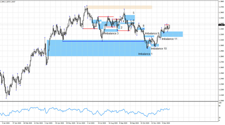 Пара GBP/USD выполнила возврат к «бычьему» имбалансу 11 после съема ликвидности с последнего «бычьего» свинга. И на этом все атаки медведей закончились. Последовала вторая реакция на «бычий» имбаланс 11, таким образом, был получен еще один сигнал на покупку еще на прошлой неделе. На самом деле, я подобные сигналы не учитываю. Если имбаланс был отработан (неважно, насколько), то в будущем меня интересуют только сигналы в совокупности со съемом ликвидности. На этот раз забора «медвежьей» не случилось, но какая разница, если несколькими днями ранее был образован еще один «бычий» сигнал в том же «бычьем» имбалансе 11? Таким образом, сделки на покупку трейдеры могут продолжать держать открытыми, так как особых признаков завершения наступления быков я не наблюдаю.