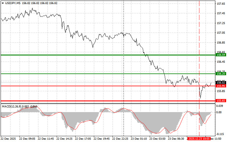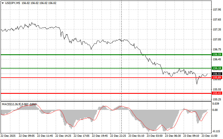 Разбор сделок и советы по торговле японской иенойТест цены 155.95 пришелся на момент, когда индикатор MACD много прошел вниз от нулевой отметки, что ограничивало нисходящий потенциал пары. По этой причине я не продавал доллар. Сегодня министр финансов Сацуки Катаяма заявила в интервью, что у страны есть свобода действий для принятия решительных мер против ослабления японской иены и колебаний валютного курса. Все это привело к падению пары USD/JPY, которое продолжилось и в ходе европейской сессии. Заявление госпожи Катаямы, прозвучавшее как гром среди ясного неба, мгновенно перевернуло представления инвесторов о дальнейшей политике Банка Японии. Подобная риторика, подкрепленная реальными действиями по повышению процентных ставок, может изменить баланс сил на валютном рынке и положить конец доминированию доллара по отношению к иене – хотя бы в краткосрочной перспективе.Но кроме заявлений японских политиков, во второй половине дня внимание трейдеров привлекут данные об изменении ВВП США за третий квартал, ключевом индексе потребительских расходов и индексе потребительской уверенности. Цифры, несомненно, окажут существенное влияние на рынки. Трейдеры будут внимательно следить за подтверждением или опровержением набирающих обороты разговоров о замедлении темпов экономического роста США. Неожиданные значения, отличающиеся от ожидаемых, способны спровоцировать колебания и переоценку рисков.Что касается внутридневной стратегии, то больше буду опираться на реализацию сценариев №1 и №2.Сигнал на покупкуСценарий №1: покупать USD/JPY сегодня планирую при достижении точки входа в районе 156.18 (зеленая линия на графике) с целью роста к уровню 156.59 (более толстая зеленая линия на графике). В районе 156.59 буду выходить из покупок и открывать продажи в обратную сторону (расчет на движение в 30-35 пунктов в обратную сторону от уровня). Рассчитывать на рост пары можно в продолжение тренда. Важно! Перед покупкой, убедитесь в том, что индикатор MACD находится выше нулевой отметки и только начинает свой рост от нее.Сценарий №2: покупать USD/JPY сегодня также планирую в случае двух подряд тестов цены 155.89 в момент, когда индикатор MACD будет находиться в области перепроданности. Это ограничит нисходящий потенциал пары и приведет к обратному развороту рынка вверх. Можно ожидать рост к противоположным уровням 156.18 и 156.59.Сигнал на продажу Сценарий №1: продавать USD/JPY сегодня планирую после обновления уровня 155.89 (красная линия на графике), что приведет к быстрому снижению пары. Ключевой целью продавцов будет уровень 155.43, где буду выходить из продаж, а также открывать сразу покупки в обратную сторону (расчет на движение в 20-25 пунктов в обратную сторону от уровня). Давление на пару сегодня вернется в случае слабой статистики по США. Важно! Перед продажей, убедитесь в том, что индикатор MACD находится ниже нулевой отметки и только начинает свое снижение от нее. Сценарий №2: продавать USD/JPY сегодня также планирую в случае двух подряд тестов цены 156.18 в момент, когда индикатор MACD будет находиться в области перекупленности. Это ограничит восходящий потенциал пары и приведет к обратному развороту рынка вниз. Можно ожидать снижения к противоположному уровню 155.89 и 155.43.Что на графике:Тонкая зеленая линия – цена входа, по которой можно покупать торговый инструмент;Толстая зелена