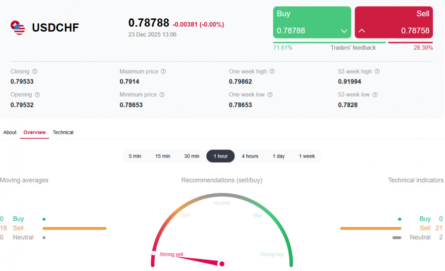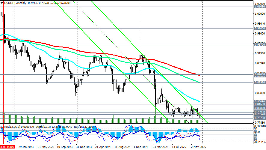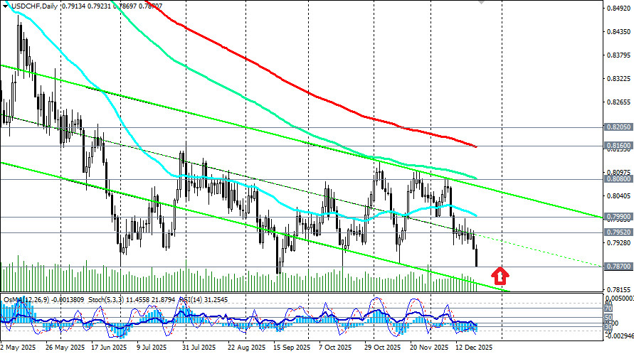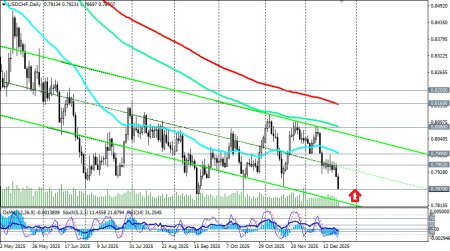 *) см. также: Торговые индикаторы InstaForex по USD/CHF[/i] Как сообщили сегодня утром в Центре европейских экономических исследований (ZEW), индекс экономических настроений, оценивающий деловой климат, ситуацию на рынке занятости и прочие аспекты, которые оказывают влияние на повседневное ведение бизнеса в Швейцарии, сократился в декабре с 12,2 до 6,2 пункта. Тем не менее, это не сильно повлияло на динамику франка, который продолжил укрепляться против доллара. Падение этого индикатора доверия указывает на более осторожные экономические перспективы, и это подтверждает тезис о склонности руководства НБШ к более мягкой денежно-кредитной политике. Так, на момент публикации данной статьи, пара USD/CHF торговалась вблизи отметки 0.7870, на 74 пункта ниже цены открытия текущей недели. Всего же с начала года пара USD/CHF потеряла в стоимости 15%, снизившись с отметки 0.9075 в начале января. Помимо того, что франк является одним из популярнейших защитных активов, впрочем, как и доллар в отдельные моменты, инвесторы также оценивают перспективы монетарных политик центральных банков США и Швейцарии, что является главным триггером движения цены.Напомним, что после того, как 10 декабря ФРС снизила процентную ставку, НБ Швейцарии на заседании 11 декабря сохранил свою процентную ставку на нулевой отметке (в последний раз показатель был пересмотрен в июне, с 025% до 0%). В сопроводительном заявлении среди прочего было сказано, что индекс потребительских цен практически не изменился, что отменяет необходимость в изменении монетарных условий. Швейцарский национальный банк продолжает придерживаться своей позиции. В квартальном отчете ЦБ сообщает, что среднесрочные инфляционные давления остаются, в основном, сдержанными, а текущая политика является подходящей для поддержки экономической активности при обеспечении ценовой стабильности. В руководстве банка предположили, что инфляция в 2025 году составит 0,2% и 0,3% в 2026 году (пересмотрено с предыдущей оценки 0,5%), ВВП 1,5% и 1,0% - в 2026 году. Экономисты отмечают замедление швейцарской экономики в 2025 году после роста в 1-м квартале. Среди прочих причин ослабления - повышение американских тарифов (изначально на 39%) на экспорт в США ряда швейцарских товаров. В ноябре, на основании соглашения между Швейцарией и США, потолок налогов был согласован на уровне 15,0% для большинства экспортных категорий. Однако, проблема сохранилась, что негативно отражается на динамике экспорта в США и динамике швейцарского ВВП. По подсчетам экономистов, он в 2026 году будет заметно ниже, чем до торговых ограничений. В ответ же на уменьшение инфляционных рисков и замедление ВВП Национальный банк Швейцарии может вновь пойти на смягчение денежно-кредитной политики. Однако, как мы можем видеть, это почти не влияет на динамику франка. Его же укрепление и снижение USD/CHF достигли уровней, когда НБШ может вновь вмешаться в торги на валютном рынке, произведя валютную интервенцию с продажей франка, как это было уже в этом году при приближении к уровню 0.7800.Хотя, пока не известно, будет ли НБШ проводить интервенцию и в каких объёмах, это усиливает напряжение на рынке. К тому же швейцарский ЦБ никогда не объявляет о подобных своих практиках ни до, ни после события. Ввиду этого, трейдерам, видимо, все же придется учитывать данный факт при построении своей стратегии на продажу пары. U