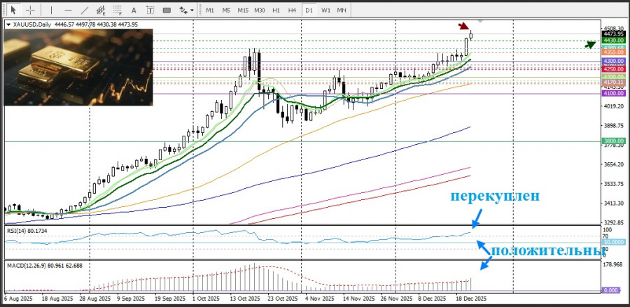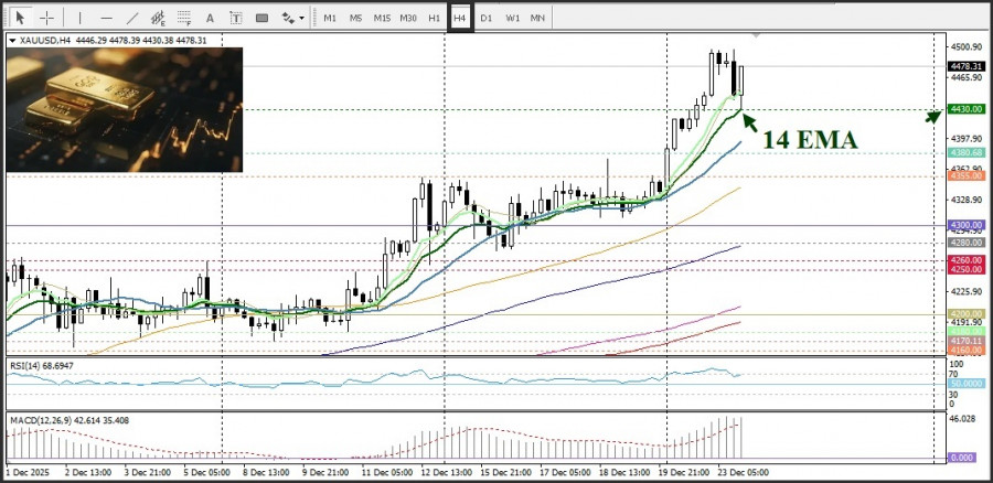 Последний этап роста также отражает переориентацию рынка в конце года, так как рынки входят в долгий праздничный период. В то время как фиксация прибыли на достигнутых уровнях может привести к краткосрочной консолидации, общая тенденция остается позитивной, и золото движется к самому сильному годовому росту с 1979 года, подорожав почти на 70% с начала года.