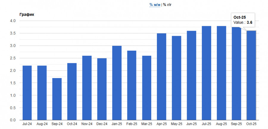 Как показали данные, годовая инфляция в Великобритании снизилась впервые за семь месяцев, что является признаком того, что ценовое давление прошло свой пик – особенно в преддверии важных решений Банка Англии и канцлера казначейства Рейчел Ривз.В отчете указано, что потребительские цены выросли на 3,6% в октябре по сравнению с аналогичным периодом предыдущего года, что ниже роста на 3,8% в сентябре. Однако данные немного превысили ожидания экономистов, ожидавших снижения инфляции до 3,5%.Снижение инфляции, хоть и незначительное, может дать передышку Банку Англии, который изо всех сил пытается сбалансировать необходимость сдерживания инфляции и предотвращение рецессии. Некоторые экономисты ожидают, что регулятор сохранит ключевую процентную ставку на прежнем уровне на своем следующем заседании, хотя это и маловероятно. Однако дальнейшее снижение инфляции в ближайшие месяцы может вынудить пересмотреть свою политику.Рейчел Ривз, канцлер казначейства, вероятно, воспримет эти данные как положительный знак, поскольку она готовится представить свой осенний бюджет. Снижение инфляции может дать ей больше пространства для маневра при разработке мер по поддержке домохозяйств и стимулированию экономического роста. Однако она по-прежнему будет осторожна, учитывая, что инфляция по-прежнему значительно превышает целевой показатель Банка Англии в 2%.Падение уровня инфляции до самого низкого уровня с июня было обусловлено меньшим ростом цен на энергоносители, чем в октябре 2024 года. Инфляция в сфере услуг снизилась до 4,5%, что ниже прогнозов Банка Англии.Фунт стерлингов отреагировал на все это падением, поскольку трейдеры увеличили ставки на смягчение ставки Банка Англии, заложив в 80% вероятность снижения ставки в следующем месяце и как минимум ещё одного снижения до конца следующего года. Однако на пути к сокращению ставки по-прежнему существуют серьёзные препятствия, не в последнюю очередь связанные с осенним бюджетом лейбористского правительства, который будет представлен на следующей неделе. Ривз пообещала фискальные планы, направленные на сдерживание высокой инфляции, и рассматривает ряд дополнительных налоговых повышений, которые могут усложнить ситуацию для Банка Англии.Как я отмечал выше, смягчение цен в октябре было в основном обусловлено ценами на газ и электроэнергию, при этом цены на проживание в отелях также оказали влияние на показатели. Однако цены на продукты питания, за которыми пристально следит Банк Англии, стали компенсирующим фактором. По данным Национальной статистики, инфляция цен на продукты питания и безалкогольные напитки ускорилась до 4,9% по сравнению с 4,5% в предыдущем месяце. Рост был обусловлен такими товарами, как хлеб, мясо, рыба и овощи.Что касается текущей технической картины GBP/USD, то покупателям фунта нужно забирать ближайшее сопротивление 1.3180. Только это позволит нацелиться на 1.3215 выше которого пробиться будет довольно проблематично. Самой дальней целью выступит область 1.3244. В случае падения пары медведи попытаются забрать контроль над 1.3133. Если это удастся сделать, пробой диапазона нанесет серьезный удар по позициям быков и столкнет GBPUSD к минимуму 1.3085 с перспективой выхода на 1.3050.Материал предоставлен компанией InstaForex - www.instaforex.com