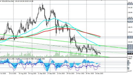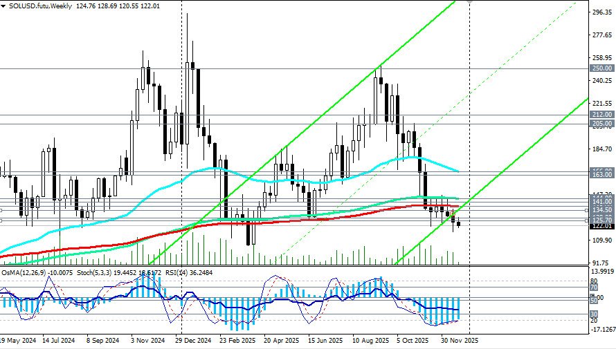 Сегодня большинство криптовалют торгуются в узком диапазоне на фоне снижения ликвидности в предпраздничные дни, отметили мы в нашем сегодняшнем фундаментальном анализе и обзоре «SOL/USD: солана как альтернатива биткоину». Что касается пары SOL/USD, то сегодня она торгуется в диапазоне 120.00–123.00, двигаясь зоне медвежьего рынка, среднесрочного – ниже ключевого уровня сопротивления 166.00 (ЕМА200 на дневном графике) и долгосрочного – ниже ключевого уровня сопротивления 138.00 (ЕМА200 на недельном графике), тестируя также на пробой стратегический уровень поддержки 128.00 (ЕМА200 на месячном графике), отделяющий глобальный бычий рынок цены от медвежьего.Пробой сегодняшнего минимума 120.55 может стать сигналом для новых коротких позиций, что также будет означать вероятность более глубокого снижения уже в рамках глобального медвежьего рынка с целями вблизи локальных уровней поддержки 112.10 (минимумы марта), 100.00 («круглый» уровень), 95.20 (минимумы апреля 2025 года). В альтернативном сценарии первым сигналом для возрождения позитивной динамики может стать пробой краткосрочного уровня сопротивления 125.70 (ЕМА200 на 1-часовом графике) и возврат цены в зону выше отметки 128.00. Цели восходящей коррекции расположены в зоне уровней сопротивления 134.50 (ЕМА200 на 4-часовом графике) – 144.00 (ЕМА144 на недельном графике), где промежуточными этапами выступают достижения ключевых уровней сопротивления 138.00, 141.00 (ЕМА50 на дневном графике). Для окончательного же возрождения восходящей динамики цене необходимо будет преодолеть ключевые уровни сопротивления 163.00 (ЕМА144 на дневном графике), 166.00. Пока же фундаментальный фон создает предпосылки для дальнейшего снижения, а технические индикаторы (в нашем случае это – RSI, OsMA, Стохастик) на дневном, недельном, месячном графиках остаются на стороне продавцов. В основном сценарии ожидаем дальнейшее снижение. Уровни поддержки: 113.00, 112.00, 111.00, 100.00, 97.00, 96.00, 95.00 Уровни сопротивления: 125.00, 125.70, 128.00, 134.50, 138.00, 141.00, 144.00, 163.00, 166.00 Торговые сценарии