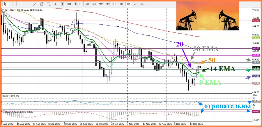 Поддержку нефть нашла на круглом уровне $58,00, как раз там, где проходит 20-дневная SMA. Если цены не удержат этот уровень, то ускорят падение к следующему круглому уровню $57,00, с некоторой остановкой на пути у слияния 9 и 14-дневных ЕМА.