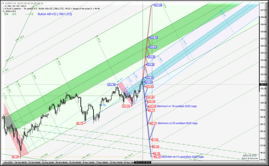 Операционный масштаб Minute (таймфрейм h4)AUD/JPY - h4 - обзор вариантов движения с 22 ноября 2025 г.Предыдущий обзор Australian Dollar vs Japanese Yen (таймфрейм Daily ) от 12.11.2025 г. 16:14___________________Australian Dollar vs Japanese YenРазвитие движения AUD/JPY-h4 c 22 ноября 2025 года продолжится в зависимости от отработки и направления пробоя границ зоны равновесия (101.60 - 101.95 - 102.30) вил младшего операционного масштаба Minuette-h1.