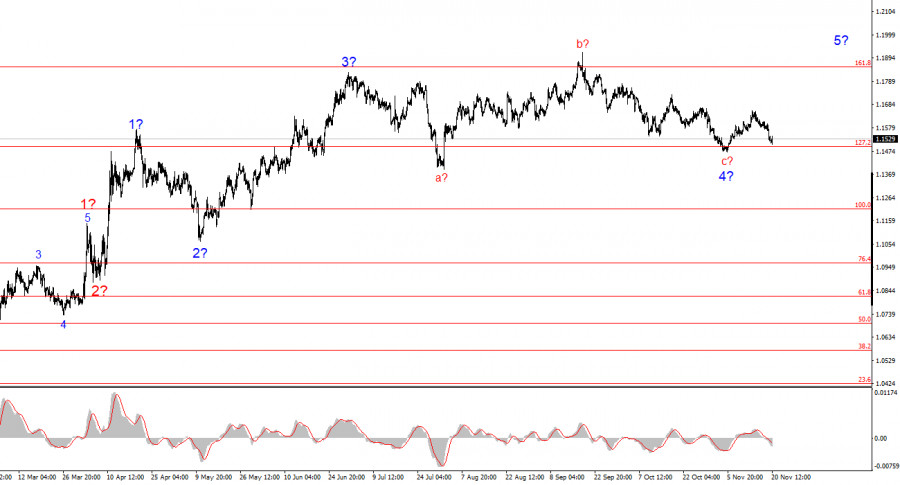 Волновая разметка 4-часового графика для инструмента EUR/USD преобразилась, но в целом имеет вполне понятный вид. Об отмене повышательного участка тренда, который берет свое начало в январе 2025 года, речи не идет, но волновая структура, начиная с 1 июля значительно усложнилась и приняла более протяженный вид. На мой взгляд, инструмент находится в стадии построения коррекционной волны 4, которая приняла нестандартный вид. Внутри этой волны мы наблюдаем исключительно коррекционные структуры, поэтому сомнений в коррекционном характере снижения не возникает. На мой взгляд, построение повышательного участка тренда не завершено, а его цели разбросаны вплоть до 25-й фигуры. Серия волн a-b-c-d-e выглядит завершенно, следовательно, я в ближайшие недели ожидаю построения нового повышательного набора волн. Мы увидели предполагаемую волну 1 или a, а сейчас инструмент находится в стадии построения волны 2 или b. Я ожидал, что вторая волна завершится в области 38,2%-61,8% по Фибоначчи от первой волны, но котировки опускались сегодня до 76,4%. Такое снижение все еще допускает построение волны 3 или с.
