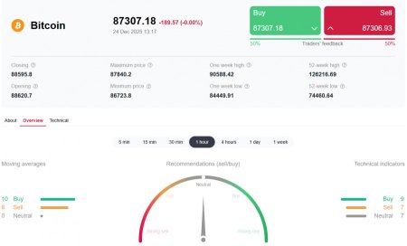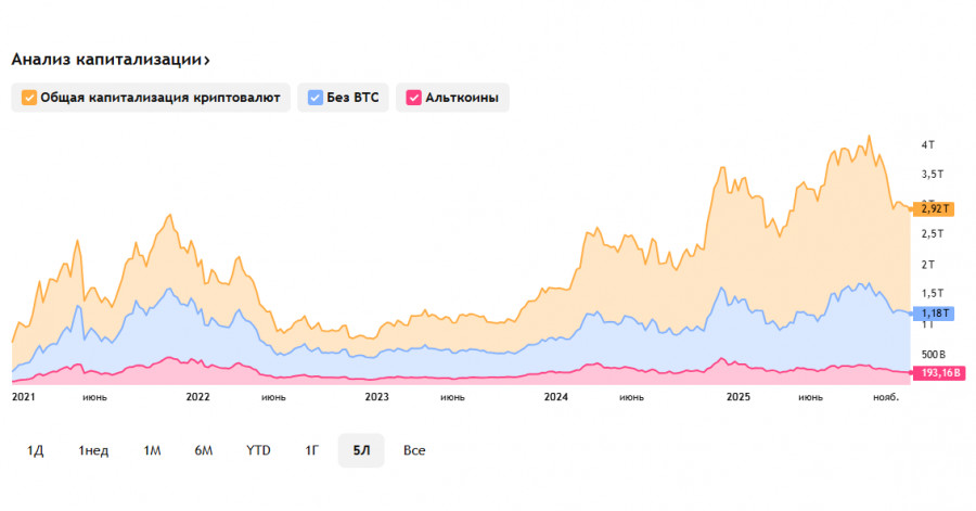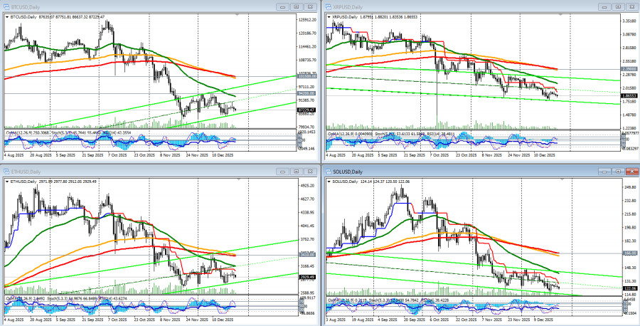 *) см. также: Торговые индикаторы InstaForex по BTC[/i] Несмотря на то что индекс «страха и жадности» переместился сегодня в зону «жадности» (59 из 100), участники крипторынка сохраняют осторожность, предпочитая рискованным активам драгметаллы, устанавливающие последовательные рекорды, отметили мы в нашем вчерашнем обзоре «[i]Крипторынок: в рождественскую неделю». Капитализация всего крипторынка продолжает сокращаться: сегодня она достигла 2,92 трлн долларов, что на 0,29% меньше, чем вчера и на 2,15% меньше, чем 2 дня назад, по данным TradingView. Игнорируя слабость доллара (см. наши обзоры Доллар: последние важные данные недели и месяца и Доллар: ВВП, ставки на смягчение монетарной политики ФРС, почти все основные криптовалюты, включая биткойн, продолжают снижаться. Технические индикаторы также «рекомендуют» пока что, в основном, короткие позиции. Общее падение стоимости первой криптовалюты Стоимость первой криптовалюты значительно сократилась, упав примерно на 23% с начала октября, когда её максимальная цена достигала отметки в 126000.00 долларов. Сегодняшняя ситуация демонстрирует колебания цены возле уровня 87000.00, что составляет снижение почти на треть относительно годового пика. Как мы можем видеть, традиционно ожидаемое предрождественское оживление рынка не произошло, а совокупная рыночная капитализация упала ниже психологически значимой отметки в 3,0 триллиона. Это свидетельствует о нежелании большинства инвесторов рисковать, а также о заметной рыночной усталости среди участников торгов. Эксперты крипторынка выделяют основные факторы падения:
