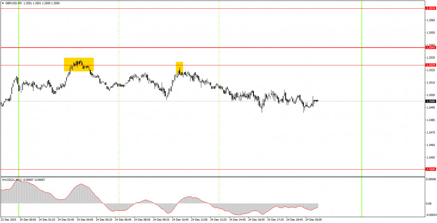 Пара GBP/USD в течение среды двигалась в схожей манере с парой EUR/USD. Попытка продолжить восходящее движение, но все же минимальная коррекция. Волатильность была ультра-низкой, но восходящая тенденция сохраняется. Можно сказать, что доллару оказал минимальную поддержку отчет по заявкам на пособия по безработице в США, количество которых оказалось ниже прогнозных значений, однако этот отчет является абсолютно второстепенным. Да и в любом случае движений в течение дня практически не было. Таким образом, торги переносятся на пятницу, а, скорее всего, на следующую неделю. С нашей точки зрения, фунт стерлингов продолжит расти в начале 2026 года, так как об этом говорят практически все таймфреймы.5M график пары GBP/USD.