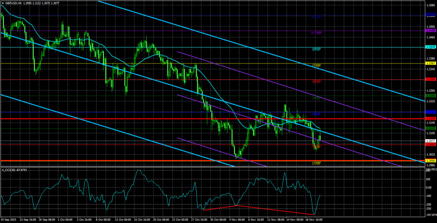 Валютная пара GBP/USD в течение четверга торговалась в полном соответствии с макроэкономической статистикой из-за океана. Подробнее об отчетах NonFarm Payrolls и уровень безработицы мы говорим в наших статьях «Торговые рекомендации». Там мы рассматриваем локальные макроэкономические событие и на младших ТФ изучаем реакцию рынка на них. В этой же статье поговорим о более глобальных факторах. Итак, вчера были опубликованы данные по безработице и Нонфармам, которых рынок ждал полтора месяца. Но давайте сразу же попытаемся ответить на вопрос – а что они меняют? Даже неважно, выросли Нонфармы или вновь снизились, превысили они прогноз или нет – ФРС не будет принимать решение по монетарной политике в декабре, основываясь на данных трехмесячной давности. Нужны данные за октябрь и ноябрь, однако Бюро статистики уже сообщило, что октябрьский отчет опубликован не будет. У Бюро просто нет никакой возможности собрать достоверную и релевантную информацию за месяц, в течение которого не работало ни само Бюро, ни все государственные службы Америки. Таким образом, данные за сентябрь являются устаревшими, а данных за октябрь попросту не будет. Отсюда простой, как пять копеек, вывод – нужно ждать начала декабря, когда будут опубликованы ноябрьские Нонфармы и безработица. И даже эти отчеты будут находиться в тени... отчета по инфляции. ФедРезерв дважды снизил ключевую ставку, а в последние три недели практически все представители Монетарного комитета(кроме, разумеется, Стивена Миррана) сообщили, что дальнейшее снижение ставки без паузы и без актуальных данных опасно и грозит ускорением темпов роста потребительских цен. Поэтому ФРС просто необходима пауза в декабре, чтобы элементарно получить весь пакет актуальной статистики и проанализировать его. Следующее заседание запланировано на 28 января, и к тому времени регулятор получит еще один пакет статистики по рынку труда, безработице и инфляции. И сможет принять решение по ставке не на основании одиночного отчета, который может быть оторван от реальности, а на основании тенденции, которая формируется с сентября-месяца, когда ФРС возобновила смягчение монетарной политики. Тем временем, фунт стерлингов вновь не возжелал начать вполне закономерный рост на основании глобальных факторов, но следует все же признать, что в последние недели у британской валюты были основания для падения. Пакет макроэкономической информации с Туманного Альбиона провалился, а инфляция снизилась, что практически дает гарантию снижения ставки Банка Англии на следующем заседании. Снижения ставки, которого вполне могло и не быть. Провал статистики, рост «голубиных» ожиданий и постоянные выступления Рэйчел Ривз(которая не может определиться с тем, нужно ли повышать налоги в Великобритании) = падение фунта. Вот и получается, что в последние пару недель падение британского фунта выглядит даже закономерно. Вот только до этого он падал полтора месяца на формальных причинах. Фунт должен был оставаться внутри бокового канала, как и евровалюта, но вместо этого покинул его. Однако мы в любом случае ждем нового витка глобального восходящего тренда. Средняя волатильность пары GBP/USD за последние 5 торговых дней составляет 78 пунктов, и продолжает падать. Для пары фунт/доллар это значение является «средним». В пятницу, 21 ноября, таким об