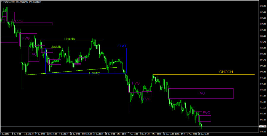 Эфир на дневном ТФ продолжает формирование новой нисходящей тенденции. В ходе обвала в «черную пятницу» был отработан первый из «бычьих» FVG, в ходе «черного вторника» был отработан следующий «бычий» FVG, в ходе последнего витка падения – еще один «бычий» FVG. Структура тенденции в данное время понятна, как день, и не вызывает никаких вопросов. Линия CHOCH проходит по уровню 3 666$. До тех пор, пока цена находится ниже него, нисходящий тренд сохраняется. В ближайшее время может начаться коррекция с очевидной целью – ближайший неотработанный «медвежий» FVG. Естественно, мы бы не стали советовать отрабатывать коррекции. Коррекции существуют для того, чтобы открывать сделки по тренду.Анализ ETH/USD 4Н.