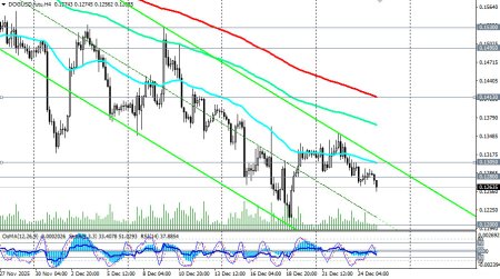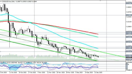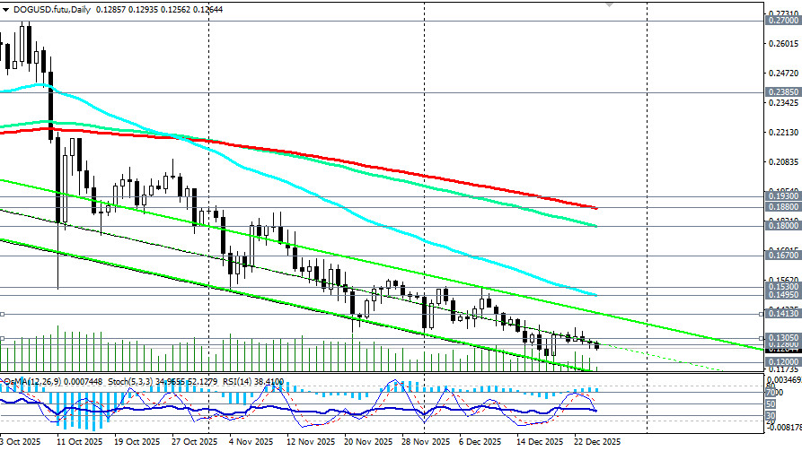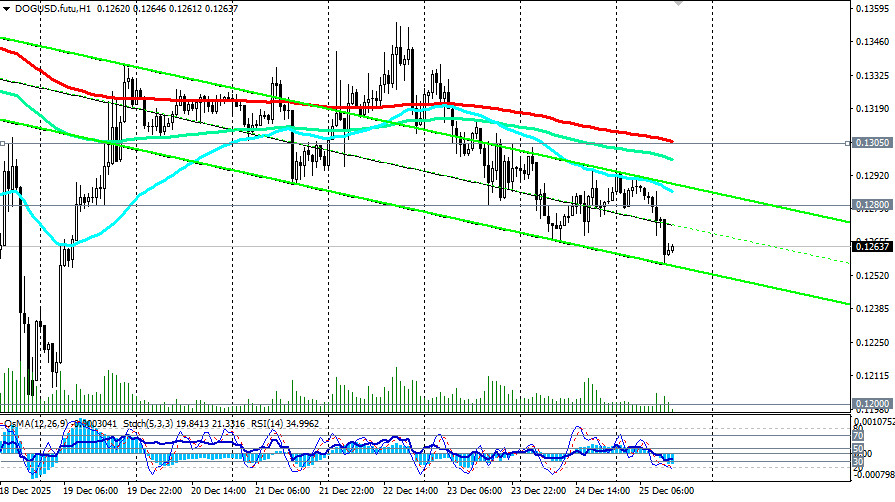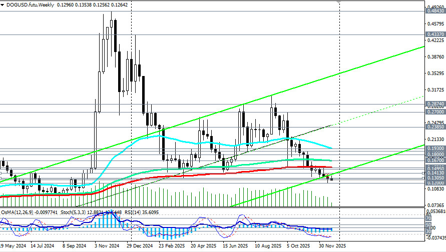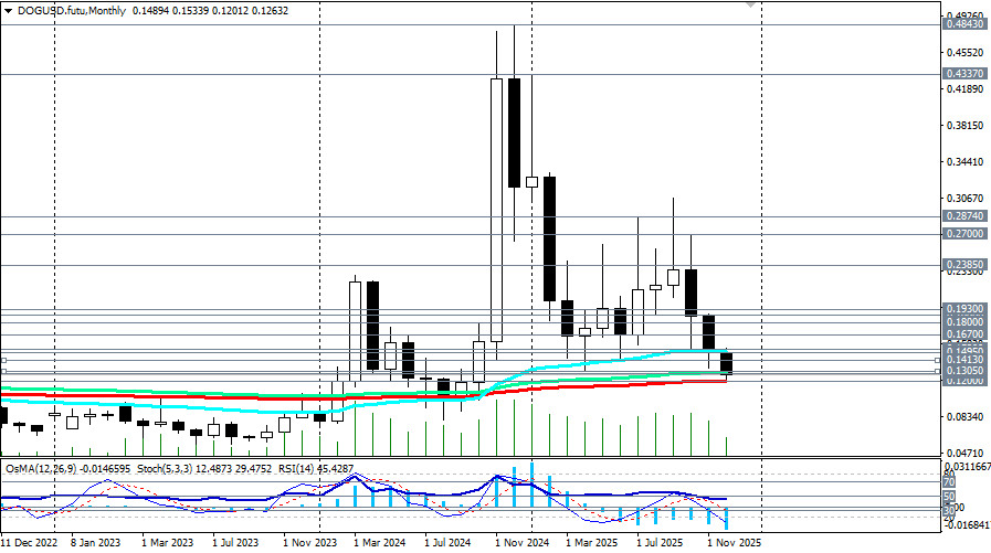 Начавшись как интернет-шутка, Dogecoin превратился в одну из самых узнаваемых мем-монет и на сегодняшний день входит в топ-10 популярных альткоинов. Изначально задуманный как сатирический взгляд на криптовалютные тренды, его стремительный взлет во многом объясняется преданными поклонниками и периодической поддержкой со стороны таких известных личностей, как Илон Маск, в социальных сетях, отметили мы в нашем сегодняшнем фундаментальном анализе и обзоре «Крипторынок: предварительные итоги 2025 года и перспективы на следующий».Однако, за 3 неполных месяца с середины октября по еще не закончившийся декабрь, DOGE (в паре DOG/USD) подешевел в 2,25 раза, опустившись с достигнутого в октябре локального максимума 0.2700 до минимума декабря вблизи 0.1200. Сегодня, в условиях праздничного рождественского периода, минимальной активности трейдеров и на момент публикации данной статьи, пара DOG/USD торговалась вблизи отметки 0.1263, немного поднявшись с внутридневного минимума 0.1257. Пара двигается в зоне долгосрочного медвежьего рынка, ниже ключевых уровней сопротивления 0.1530 (ЕМА200 на недельном графике), 0.1670 (ЕМА144 на недельном графике). Пробой же стратегического уровня поддержки 0.1200 (ЕМА200 на месячном графике DOG/USD) отправит монету в сторону своих минимальных значений с момента выпуска и появления DOGE на рынке и к значениям 0.0400 – 0.0500. Однако, все же будем надеяться на более позитивный сценарий и возврат к росту как всего крипторынка, так и отдельных монет, в частности DOGE. Поэтому в альтернативном сценарии первым сигналом для начала его реализации может стать пробой сегодняшнего максимума 0.1294 и важного краткосрочного уровня сопротивления 0.1305 (ЕМА200 на 1-часовом графике). В случае развития восходящей коррекции целями станут отметки вблизи зоны сопротивления 0.1495 (ЕМА50 на дневном графике) - 1.1530 (ЕМА200 на недельном графике). Однако, для полного возврата восходящей динамики (в долгосрочном и среднесрочном периодах) цене необходимо закрепиться в зоне выше ключевых уровней сопротивления 0.1880 (ЕМА200 на дневном графике), 0.1900, 0.1930 (ЕМА50 на недельном графике). Пока же в основном сценарии ожидаем дальнейшее снижение цены. Первым сигналом для новых продаж может стать пробой сегодняшнего минимума 0.1257. Технические индикаторы (в нашем случае это – RSI, OsMA, Стохастик) на дневном, недельном, месячном графиках также находятся на стороне продавцов. Уровни поддержки: 0.1260, 0.1200, 0.1100, 0.1000, 0.0900, 0.0800, 0.0700, 0.0500, 0.0400 Уровни сопротивления: 0.1280, 0.1300, 0.1305, 0.1400, 0.1413, 0.1495, 0.1500, 0.1530, 0.1600, 0.1670, 0.1800, 0.1880, 0.1900, 0.1930, 0.2000 Торговые сценарии