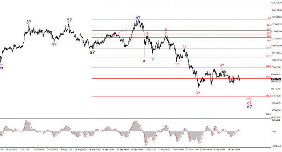 Биткоин предположительно завершил построение коррекционной волны 4, которая приняла пятиволновой коррекционный вид a-b-c-d-e. Продажи биткоина начались, но пока слабые. На старшем масштабе продолжает построение коррекционная структура a-b-c, которая легко может трансформироваться в полноценный импульсный участок тренда. Напомню, что пик волны b этой структуры вышел за пик последней волны предыдущего повышательного участка тренда, чего в классическом волновом анализе быть не может. Однако я продолжаю настаивать на том, что нужно быть более гибкими при определении волн и волновых структур. В ближайшее время рынок может продолжить построение предполагаемой волны 5 в с в с, лоу которой должен находиться ниже отметки 80500$. Скорость снижения цифрового золота вполне позволяет предполагать импульсный характер текущего участка тренда. Поэтому 80000$ – это далеко не предел падения. Интересное заявление сделал генеральный директор 10T Holdings Дэн Тапиеро. Он считает, что «посыпать голову пеплом» биткоину еще рано. По его словам, биткоин находится в середине «бычьего» цикла, а уже в следующем году может достичь отметки 180000$. «Соотношение капитализации биткоина к золоту не меняется с 2021 года», - сообщил г-н Тапиеро, намекая на некоторую недооцененность биткоина, его взаимосвязь с золотом. По мнению Тапиеро, в 2026 году золото также продолжит расти, что вызовет также рост цифрового золота. На мой взгляд, такой сценарий вполне возможен, но важно понимать, о каком масштабе трендов мы говорим. Если брать относительно малый масштаб, то в данное время строится понижательный участок тренда. Когда он будет завершен? Может быть, через пару месяцев, а может быть, через пару лет. Однако если говорить о глобальном масштабе, то биткоин находится в восходящем тренде всю свою историю существования. Следовательно, может быть, не в 2026 году, но биткоин имеет вполне реальные шансы увидеть отметку 180000$ своими глазами.