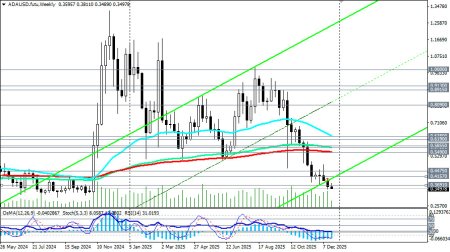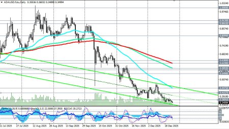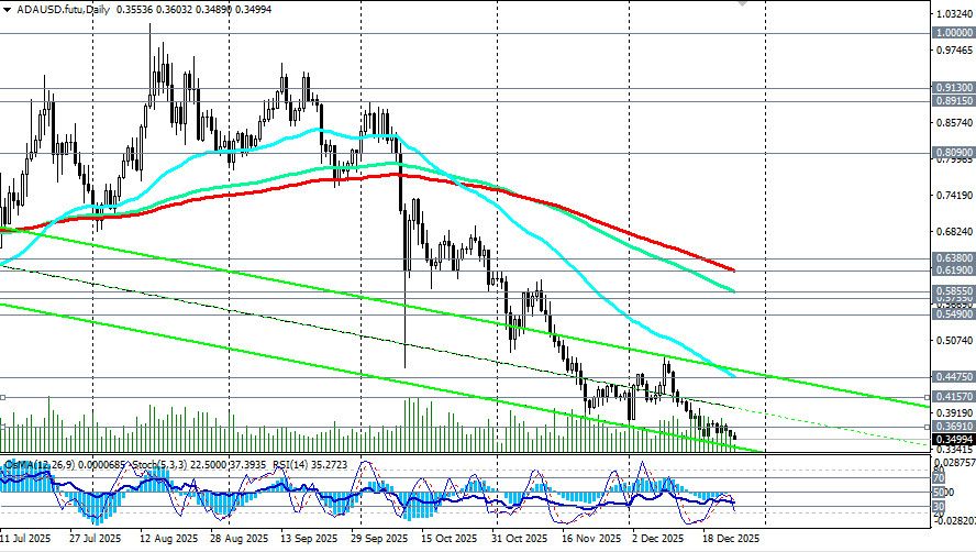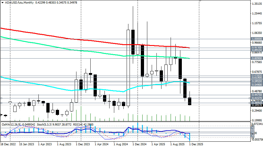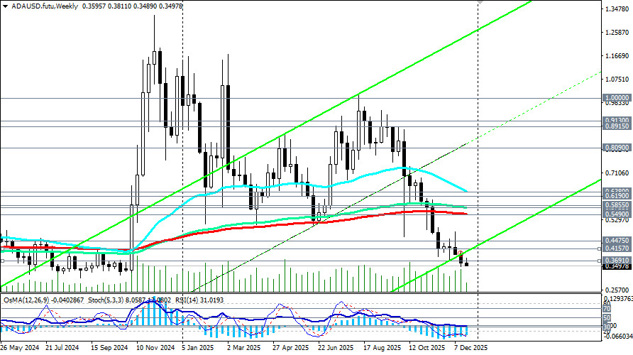 Нисходящая тенденция, начавшая активно формироваться в середине октября, сохраняется. Сегодня, в условиях праздничного рождественского периода, минимальной активности трейдеров и на момент публикации данной статьи, пара ADA/USD торговалась вблизи отметки 0.3500, на 10 пунктов выше внутридневного минимума 0.3490. Пара двигается в зоне долгосрочного медвежьего рынка в сторону минимальных значений с момента выпуска монеты и появления на рынке, предположили мы в нашем сегодняшнем фундаментальном анализе и обзоре «Крипторынок: предварительные итоги 2025 года и перспективы на следующий». С этой точки зрения, пробой сегодняшнего минимума 0.3490 может стать сигналом для новых коротких позиций с целями в зоне локальных уровней поддержки 0.3300 – 0.3000 (минимумы июля – ноября 2024 года). С середины октября и после пробоя 200-периодной скользящей средней на дневном графике, проходившей на тот момент через отметку 0.7740, ADA/USD двигается в зоне среднесрочного медвежьего рынка, а с середины ноября – и в зоне долгосрочного медвежьего рынка, ограниченного ключевым уровнем сопротивления 0.5490 (ЕМА200 на недельном графике). Технические индикаторы (в нашем случае это – RSI, OsMA, Стохастик) на дневном, недельном, месячном графиках остаются на стороне продавцов, подтверждая преимущество коротких позиций. Альтернативный же сценарий будет подразумевать восходящую коррекцию и рост в сторону зоны уровней сопротивления 0.4475 (ЕМА50 на дневном графике) – 0.4500 («круглый» уровень). Первым сигналом здесь может стать пробой важного краткосрочного уровня сопротивления 0.3691 (ЕМА200 на 1-часовом графике). Однако, здесь мы пока говорим только о восходящей коррекции. Лишь пробой максимума месяца и отметки 0.4830 и дальнейший рост могут усилить позиции покупателей и вероятность дальнейшего роста в сторону ключевых уровней сопротивления 0.5855 (ЕМА144 на дневном графике), 0.6190 (ЕМА200 на дневном графике), отделяющих среднесрочный бычий рынок от медвежьего. Пробой уровня сопротивления 0.6380 (ЕМА50 на недельном графике) подтвердит возврат цены в зону долгосрочного и среднесрочного бычьих рынков, вновь сделав преимущественными длинные позиции. Лишь пробой ключевого стратегического уровня сопротивления 0.9130 (ЕМА200 на месячном графике) и дальнейший рост будут означать слом глобального медвежьего тренда. Предпочтение в текущей ситуации следует отдавать коротким позициям. открыть торговый счет + зарегистрироваться в системе копирования сигналов + инвестировать в ПАММ-системеМатериал предоставлен компанией InstaForex - www.instaforex.com