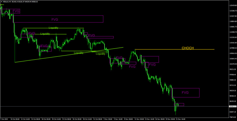 На 4-часовом таймфрейме техническая картина также однозначно указывает на нисходящий тренд. Линия CHOCH(слом тренда) проходит на уровне 107 400$, и только выше этого уровня можно будет считать, что локальная тенденция сломлена. До этого нисходящий настрой рынка сохраняется даже в краткосрочной перспективе. На 4-часовом ТФ были сформированы еще два «медвежьих» FVG, оба отработаны, поэтому падение может быть продолжено даже на выходных. Когда «медвежьи» паттерны начнут игнорироваться, это будет первый признак назревающей коррекции.Рекомендации по торговле BTC/USD: