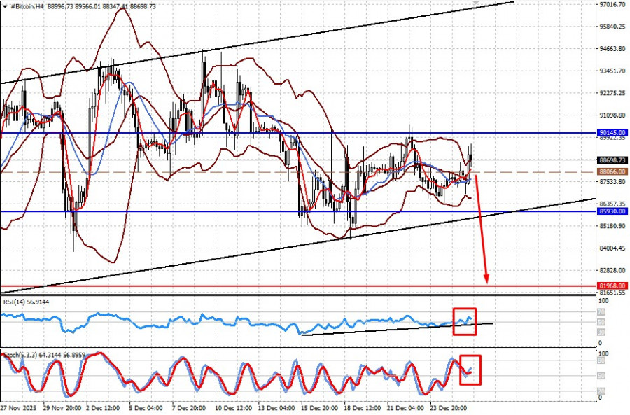 #USD Показатель торгуется на уровне 98.00 пункта, на основании изложенного в статье прогноза полагаю, что он может упасть в начале нового года до 96.50 пункта. Уровнем для его продажи может служить отметка 97.78. Bitcoin Криптовалюта остается под прессингом, и ее невозможность вырасти выше отметки 90150.00 может привести к возобновлению падения сначала к 85930.00, а затем и к 81968.00. Уровнем для ее продажи может служить отметка 78066.00.Материал предоставлен компанией InstaForex - www.instaforex.com