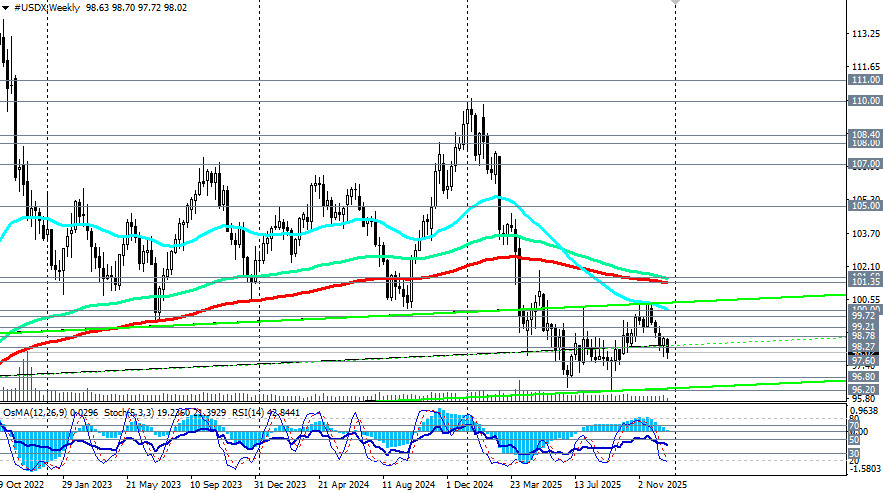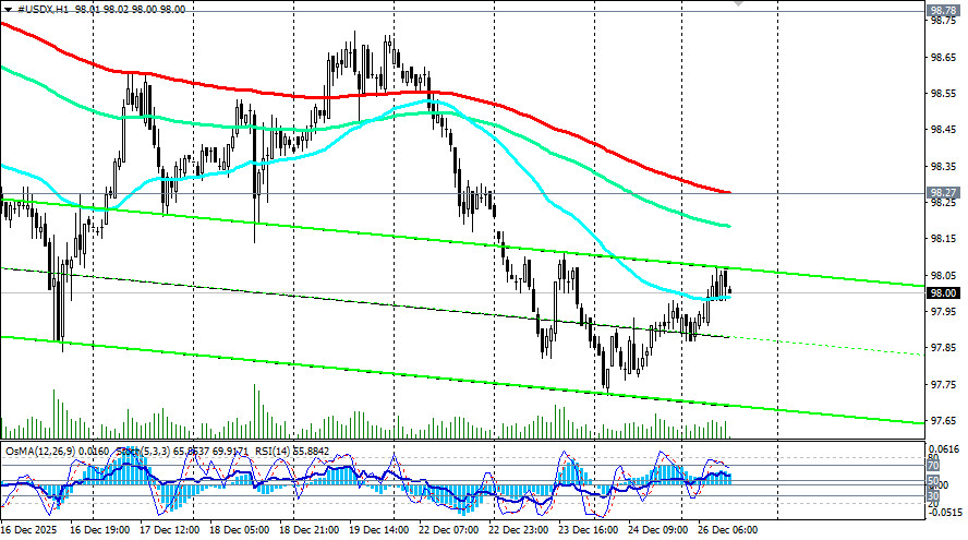 В конце сокращенной рождественской недели, которая также является последней полной торговой неделей месяца и уходящего года, доллар США демонстрирует некоторую восходящую коррекцию, в целом оставаясь под давлением.Так, на момент публикации данной статьи, индекс доллара USDX находился вблизи отметки 98.00, чуть ниже внутридневного максимума 98.07 и ниже ближайшего важного краткосрочного уровня сопротивления 98.27 (ЕМА200 на 1-часовом графике USDX). Все говорит о том, что эту неделю и месяц индекс доллара USDX закроет на негативной территории. Нисходящее движение американской валюты связано, в первую очередь, с неясностью относительно будущих решений Федеральной резервной системы США. Последние экономические показатели ставят перед чиновниками непростую дилемму: инфляция замедлилась (индекс потребительских цен снизился с 3,0% до 2,7%, а базовая инфляция упала с 3,0% до 2,6%), но безработица выросла, достигнув пика с 2021 года на уровне 4,6%. Ускорение роста ВВП на 4,3% в 3-м квартале повышает опасения повторного всплеска инфляции. Однако, последние данные сигнализируют о рисках дальнейшего охлаждения рынка труда, намекая на возможное снижение ставок. Экономисты пока склоняются к мнению, что политика смягчения сохранится, учитывая запланированную смену руководства ФРС: уход Джерома Пауэлла и приход Кевина Хассета, сторонника более мягкой кредитно-денежной политики, возможно, приведет к уменьшению независимости регулятора и значительному сокращению затрат на привлечение капитала в следующем году. В уходящем же году курс доллара продолжал оставаться ключевым маркером для финансовых рынков. 2025 год был годом волатильности. Сочетание «тарифов Трампа», ожиданий смягчения монетарной политики ФРС, смены аппетита к риску и фискальных дискуссий внутри США двигало и раскачивало рынки. Основные моменты