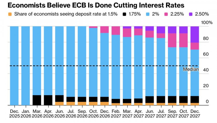 Однако по факту валютный блок оказался куда более устойчивым к пошлинам США на импорт, а ЕЦБ удалось приручить инфляцию. Большинство экспертов Bloomberg считают, что он закончил цикл ослабления денежно-кредитной политики, а ФРС еще нет. Если так, то EUR/USD просто обязана расти дальше.