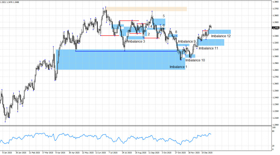 FxSignal 26-12-2025, 16:37 29 Аналитика, прогнозы валютного рынкаПара GBP/USD выполнила отбой от «бычьего» имбаланса 11 и возобновила процесс роста, как я и предполагал. Реакция на «бычий» имбаланс 11 оказалась двойной, первый один сигнал на покупку был получен еще на прошлой неделе. На данный момент сделки на покупку находятся в прибыли уже около 400 пипсов по самым скромным подсчетам, и трейдеры могут сами решать, что делать с ними дальше. Рынок был закрыт в четверг, возобновил свою работу в пятницу, однако активности на рынке практически нет. Информационный фон отсутствует, а желание торговать в день, «оторванный» от других дней, вряд ли возникнет у трейдеров в последний день недели. Но в дальнейшем я ожидаю, что процесс роста британца будет продолжен. Отмечу, что на этой неделе был образован новый «бычий» имбаланс 12, который в будущем может послужить поводом для открытия новых сделок на покупку для тех трейдеров, кто не сделал этого раньше. И если британец получит реакцию на этот паттерн, это будет уже четвертый по счету «бычий» сигнал. Графическая картина сейчас следующая. «Бычий» тренд по британцу может считаться завершенным, но «бычий» тренд по европейцу – нет. Таким образом, европейская валюта может тянуть за собой вверх фунт, хотя британец и сам по себе неплохо растет в последние недели. Быки оттолкнулись от «бычьего» имбаланса 1, от «бычьего» имбаланса 10, от «бычьего» имбаланса 11 дважды. Сигналов на покупку была образована масса. Сверху у британца «медвежьих» паттернов нет, остановить рост нечему. Зато снизу образовалась новая зона поддержки – имбаланс 12. Таким образом, я предполагаю рост к пикам года – около уровня 1,3765. В пятницу информационный фон отсутствовал. Однако до конца года могут быть получены новые графические сигналы на покупку, да и сам рост может быть продолжен на следующей неделе. Для многих европейцев и американцев Новый год, как праздник, имеет меньший приоритет, чем Рождество Христово. В США общий информационный фон остается таковым, что ничего, кроме падения американца, в долгосрочном плане ожидать нельзя. Ситуация в США остается достаточно сложной. «Шатдаун» длился полтора месяца, демократы и республиканцы договорились о финансировании лишь до конца января. Статистики по рынку труда США не было полтора месяца, а последние данные вряд ли можно считать позитивными для доллара. Последние три заседания FOMC завершились принятием «голубиного» решения, а последняя статистика по рынку труда допускает четвертое подряд смягчение ДКП в январе. На мой взгляд, у быков есть все, чтобы продолжать новое наступление и выполнить возврат к пикам года. Для «медвежьего» тренда нужен сильный и стабильный для американца позитивный информационный фон, которого при Дональде Трампе сложно ожидать. Да и самому президенту США не нужен дорогой доллар, так как торговый баланс в этом случае останется дефицитным. Поэтому в «медвежий» тренд по британцу я по-прежнему не верю, несмотря на довольно сильное падение, которое длилось два месяца. Слишком много факторов риска остается висеть мертвым грузом на долларе. Текущий «бычий» тренд можно считать завершенным, так как котировки выполнили падение ниже двух лоу (от 12 мая и 1 августа), но за счет чего медведи собираются двигать фунт дальше вниз? Именно потому, что я не могу ответить на этот вопрос, я не 