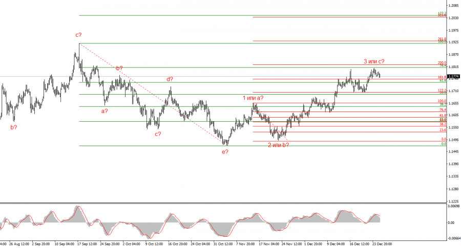 Волновая разметка и пустой новостной календарь. На основании этих двух видов анализа я могу предположить, что до конца года и в начале следующего года американская валюта может немного подрасти. Причем, в этом обзоре нас будет интересовать в большей степени волновая разметка инструмента EUR/USD, а GBP/USD с высокой долей вероятности будет тянуться к евро. Итак, по европейской валюте мы видим построение трехволновой структуры, которая может быть лишь самым началом глобальной волны 5. Внутри волны 3 или с этой структуры вполне отчетливо прослеживается пятиволновый набор волн, как и должно быть. Инструмент попытался построить убедительную волну 5 в 3 или с, но начались праздники, активность рынка и амплитуда движений снизились до минимальных значений. И вместо сильной волны 5 мы увидели укороченную версию. Следовательно, можно предположить, что построение волны 3 или с завершено. Если это действительно так, то с текущих отметок или чуть выше может начаться построение волны 4 или же нового понижательного набора волн. Напомню, что глобальная волна 4 приняла трехволновой вид, но теоретически может получиться более протяженной. Следовательно, полностью исключать новое падение инструмента тоже нельзя. На мой взгляд, новостной фон не позволит рынку повышать спрос на доллар, но всякое может случится в начале 2026 года, да и рынок может по-разному интерпретировать полученную информацию. Декабрь для доллара получился слабым месяцем, но чего еще следовало ожидать от этой валюты с таким-то новостным фоном? Практически все наиболее важные отчеты, кроме ВВП в третьем квартале, оказались слабее ожиданий рынка или же просто слабыми. А ФРС в декабре в третий раз подряд снизилась процентную ставку. В январе вновь будут иметь значение отчеты по безработице, рынку труда и инфляции. Причем, чем сильнее упадет инфляция, тем быстрее продолжит цикл смягчения денежно-кредитной политики ФРС. Чем сильнее будет «охлаждаться» рынок труда(а о восстановлении пока говорить не приходится), тем в более сложном положении окажется ФРС. Обратите внимание на другие мои статьи: Анализ EUR/USD. 26 декабря. Доллар получает весь декабрь собирал тумаки