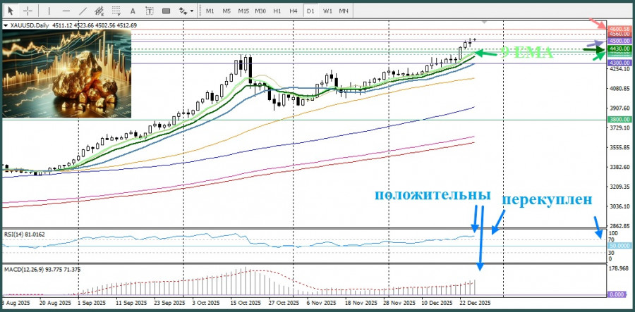 В краткосрочной перспективе золото может консолидироваться, так как отсутствие новых драйверов и фиксация прибыли в конце года могут оказать давление на рынок. Однако основной тренд остается восходящим, что говорит о вероятности продолжения роста и в 2026 году.