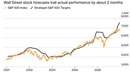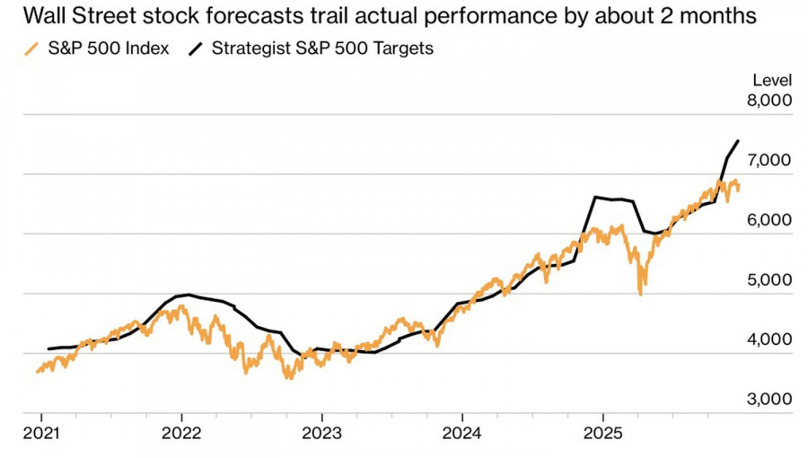 Рождество. Время прогнозов. Ни у кого нет хрустального шара, и аналитики Уолл-стрит пытаются сделать невозможное. Предсказать будущее S&P 500 в условиях геополитических конфликтов, стремления Дональда Трампа изменить мир и подмять под себя ФРС. В условиях зависимости широкого фондового индекса от горстки крупных компаний. Однако попытка, как известно, не пытка. По данным Piper Sandler, прогнозы, как правило, отстают от фактических значений на два месяца. Важны не конкретные цифры, значение имеет направление? Динамика отставания прогнозов от фактической динамики S&P 500