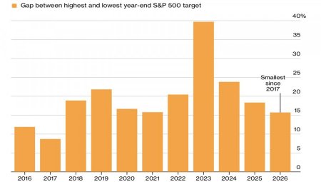 Консенсус-оценка экспертов Уолл-стрит предполагает рост S&P 500 на 11% в 2026. На исходе 2024 ожидалось, что широкий фондовый индекс поднимется на 9% в 2025. По факту получилось вдвое больше и на 3 п.п. больше, чем самый «бычий» прогноз. На следующий год он составляет 8000. Его выставили Oppenheimer и Deutsche Bank. В основе лежит предположение о силе экономики США, которая будет способствовать увеличению корпоративных доходов и вкупе с продолжением цикла монетарной экспансии ФРС приведет к продолжению ралли американского рынка акций. Однако эти драйверы уже во многом учтены в котировках S&P 500, как и тема технологий искусственного интеллекта. Этими козырями машут большинство аналитиков Уолл-стрит. А когда все в одной лодке, не требуется рецессии, чтобы ее перевернуть. Достаточно каких-либо разочарований по корпоративным доходам или по макростатистике, чтобы спровоцировать взлет волатильности и запустить коррекцию широкого фондового индекса. Действительно, разбежка между самым «бычьим» и самым «медвежьим» прогнозом составляет всего 16 п.п. Речь идет о минимальной разнице с 2017. Динамика спредов «бычьих» и «медвежьих» прогнозов по S&P 500