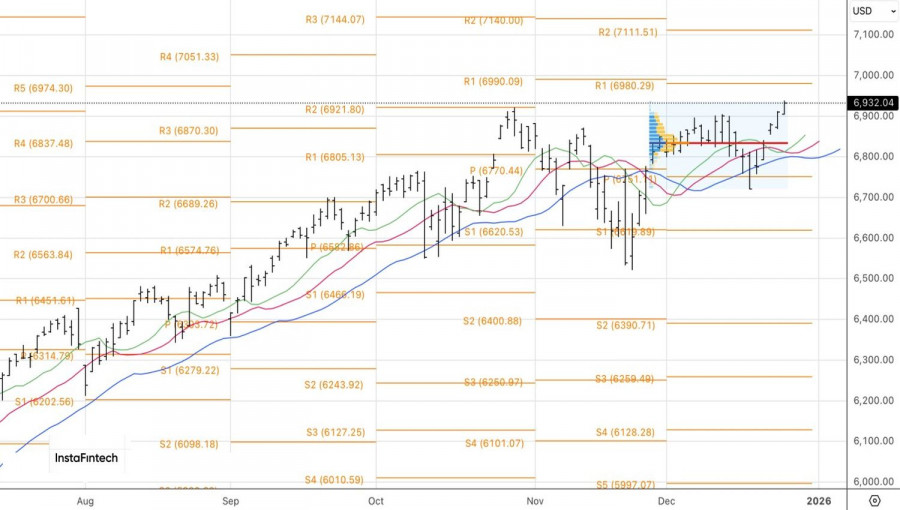 Stifel и Bank of America ожидают роста S&P 500 до 7000-7100. Причем в пессимистичных сценариях развития событий он может рухнуть до 5280. Экономика США держится на эффекте богатства и капитальных затратах в технологии ИИ. Проверка реальности искусственного интеллекта может обернуться серьезными распродажами широкого фондового индекса, перевернуть с ног на голову эффект богатства и в конечном итоге завершиться рецессией.На Рождество не хочется быть пессимистом. Консенсус-прогноз экспертов Bloomberg предполагает расширение экономики США на 2% в 2026. Речь не идет о спаде, а значит, градус тревожности за американский рынок акций может быть снижен. Тем не менее инвесторы должны быть начеку. В этом мире возможно все. Технически на дневном графике S&P 500 имеет место рост котировок на протяжении четырех торговых сессий подряд с восстановлением тренда и выходом на рекордные пики. Рынок уверенно двигается к пивот-уровням на 7000 и 7100. Пока широкий фондовый индекс торгуется выше ключевой поддержки в виде справедливой стоимости на 6830, следует сохранять акцент на покупки. Материал предоставлен компанией InstaForex - www.instaforex.com