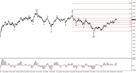 Волновая картина инструмента GBP/USD видоизменилась. Понижательная коррекционная структура a-b-c-d-e в C в 4 носит завершенный вид, как и вся волна 4. Если это действительно так, я ожидаю, что основной участок тренда возобновит свое построение с первоначальными целями около 38 и 40 фигур. В краткосрочном плане я ожидал построение волны 3 или с с целями, расположенными около отметок 1,3280 и 1,3360, что приравнивается к 76,4% и 61,8% по Фибоначчи. Эти цели достигнуты. Волна 3 или с пока продолжает свое построение и в данное время осуществляется четвертая попытка прорыва отметки 1,3450, что приравнивается к 61,8% по Фибоначчи. Цели движения – 1,3550 и 1,3720.Основные принципы моего анализа: