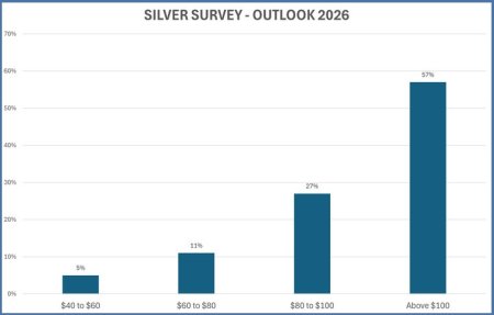 57% или 212 розничных трейдеров, предполагают, что в следующем году цена на серебро превысит $100 долларов за унцию, а сейчас спотовая цена уже близка к $80 долларам.