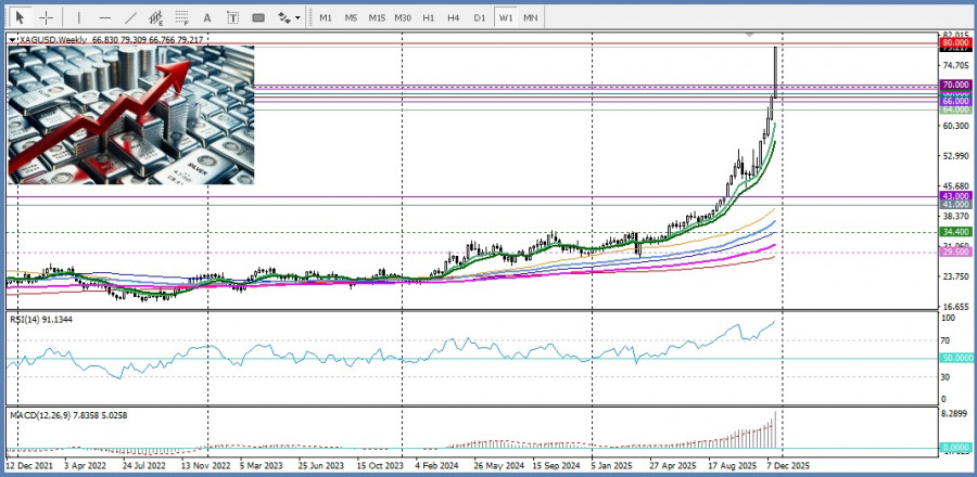 1 декабря серебро достигло нового исторического максимума около $58,50 долларов за унцию, и цены на серебро начали резко расти. К 8 декабря они превысили $60 долларов за унцию, а менее чем через две недели торговались выше $70 долларов.