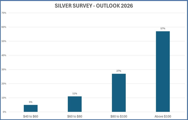 На текущий момент, серебро установило новый исторический максимум.На закончившейся неделе в опросе о серебре приняло участие 176 розничных инвесторов, и почти большинство участников рынка прогнозируют, что в 2026 году цена превысит $100 долларов за унцию.